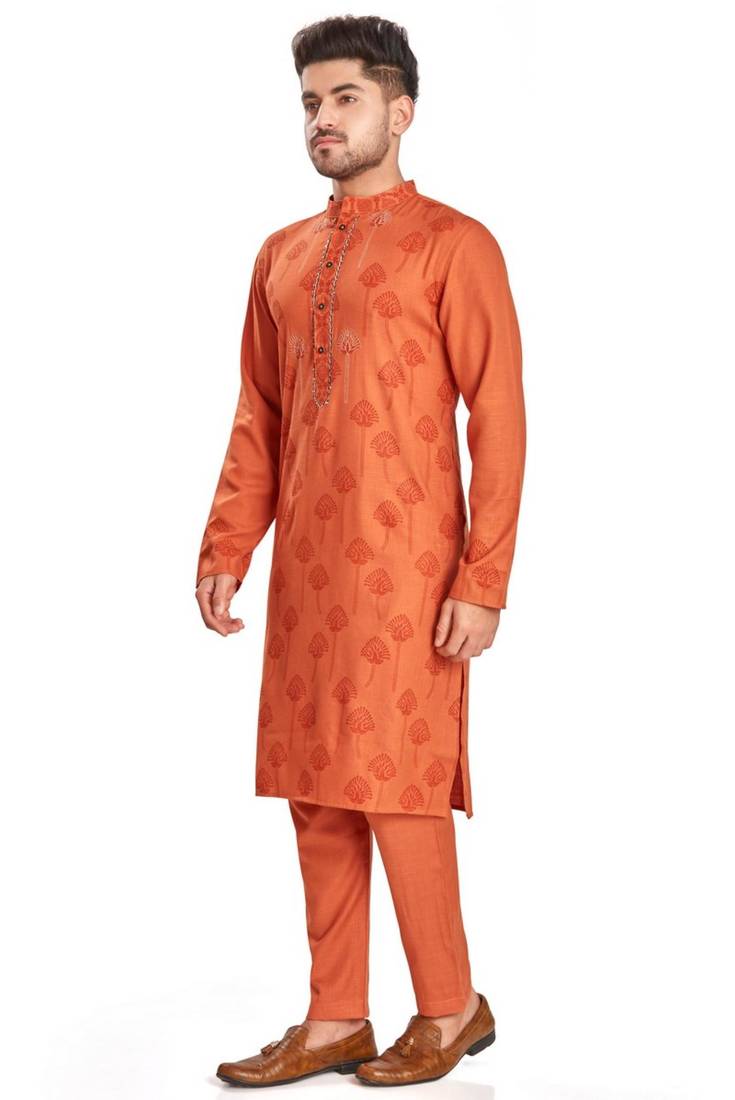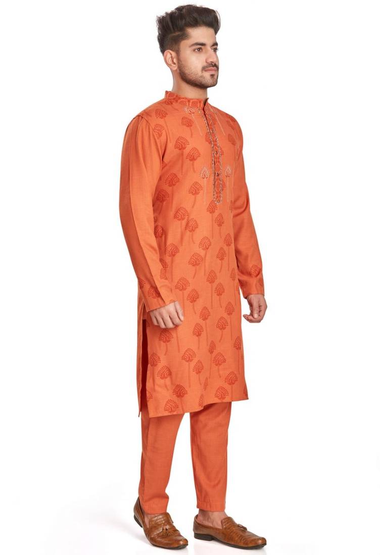 Orange hand block printed kurta with embroidery viscos klurta payjama ethnic wear :: festive wear