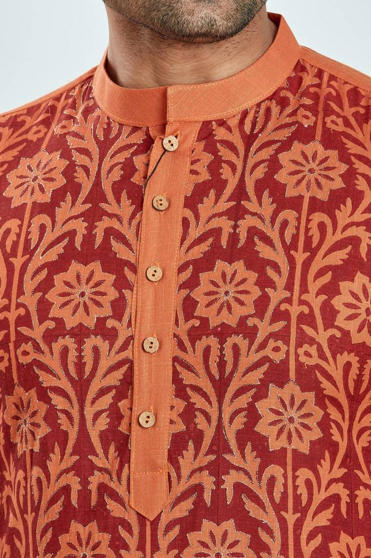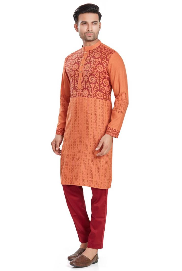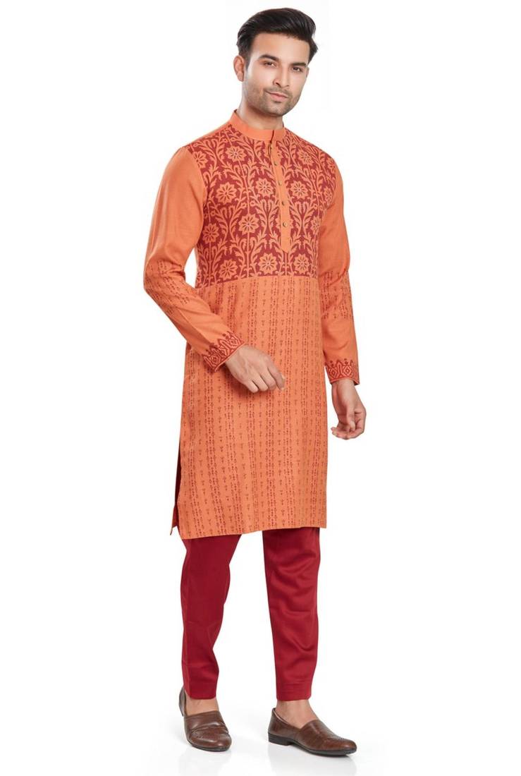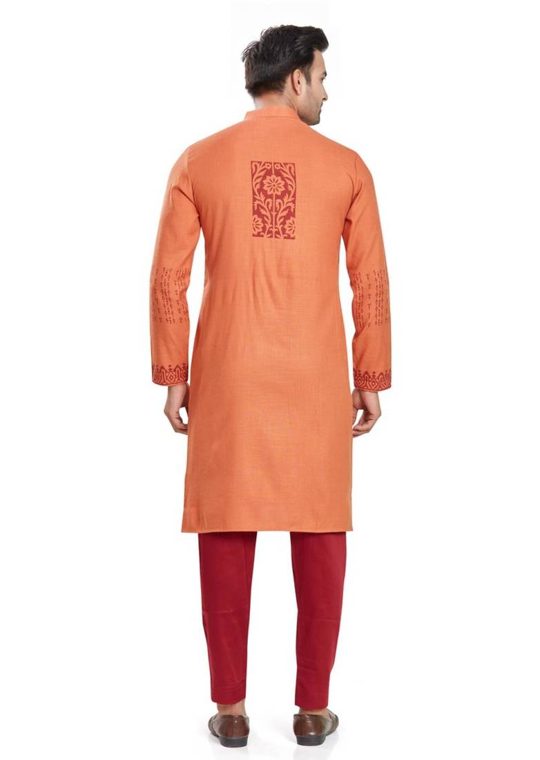 Orange hand block printed kurta with embroidery viscos kurta payjama ethnic wear :: festive wear