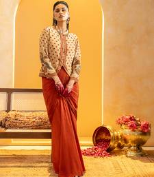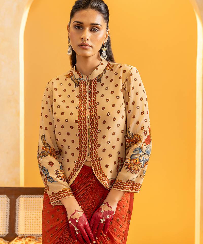 Product Description | Beige Rangtara Jacket With Long Sleeves, Paired With Printed Drape Skirt Set In Crepe.
