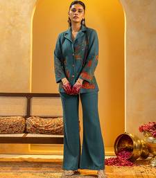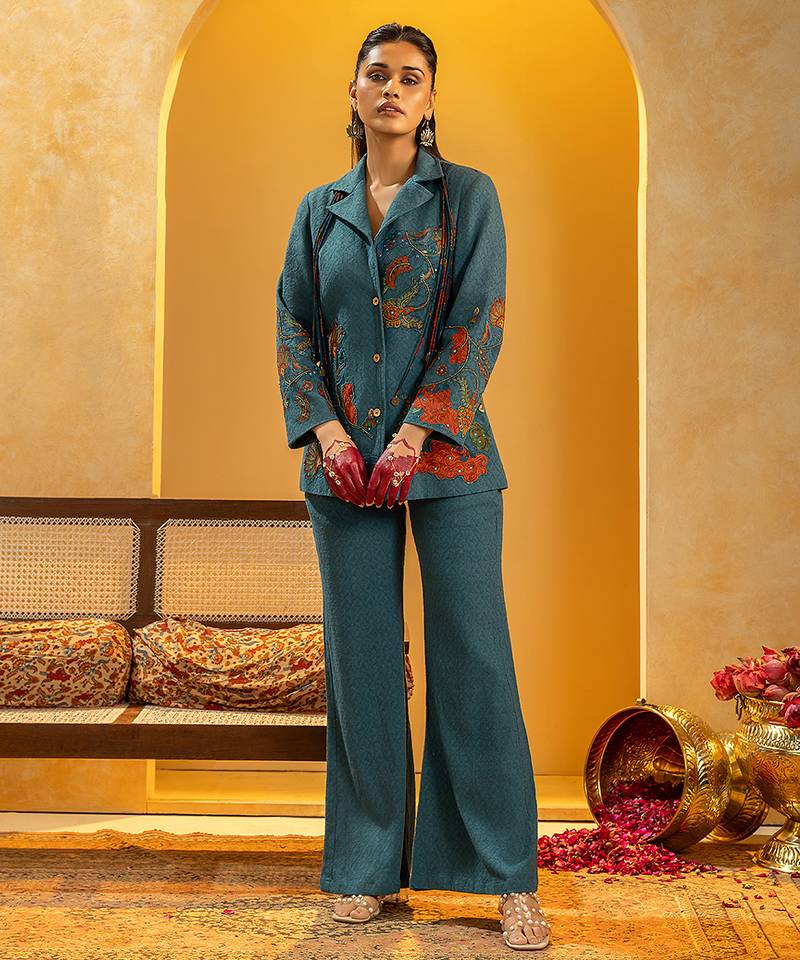 Product Description | Blue Rangtara Appliquéd Blazer With Tie Up Strings, Paired With Solid Kadi Cotton Pants.
