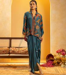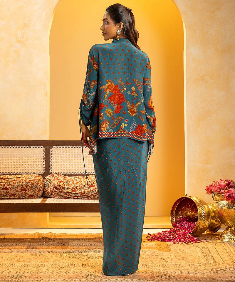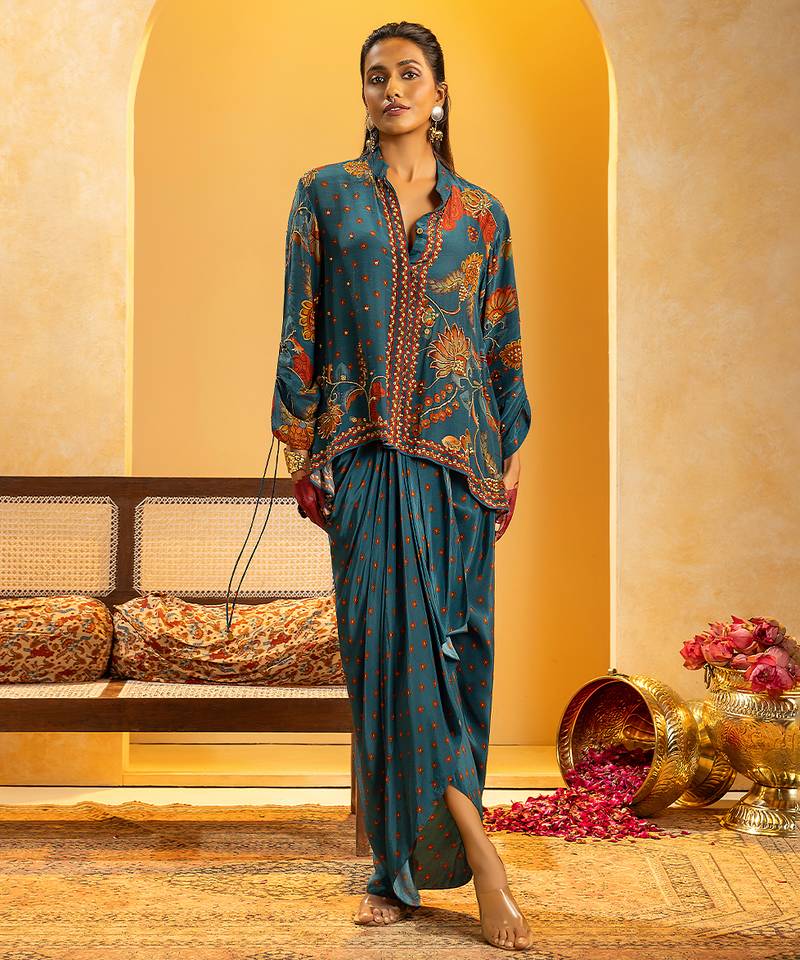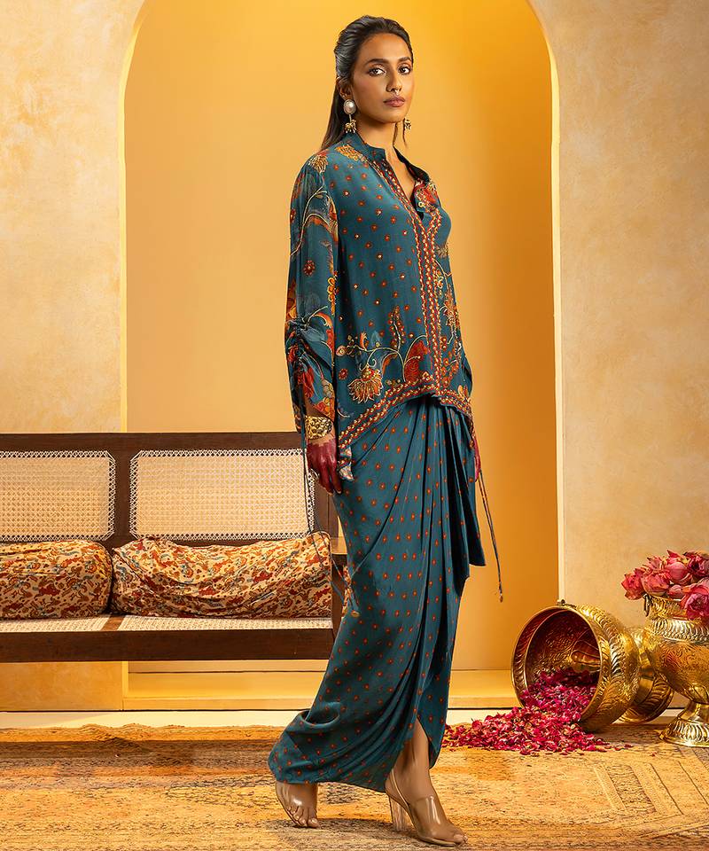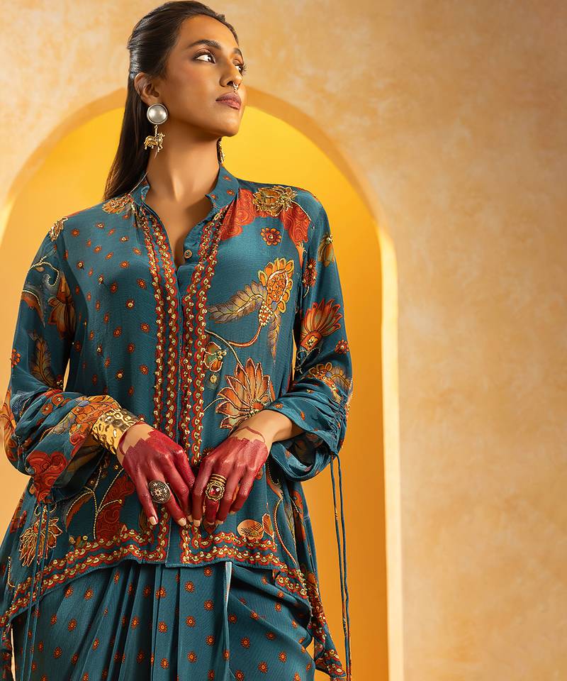 Product Description | Blue Rangtara Embellished Shirt With Gathered Sleeves, Paired With A Printed Crepe Skirt.
