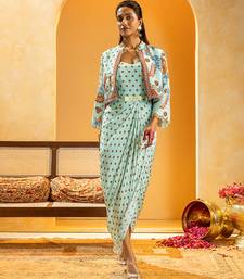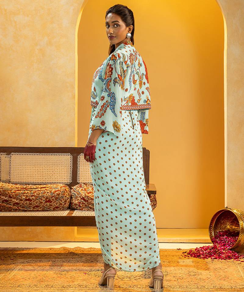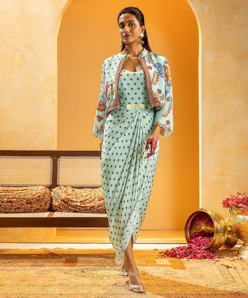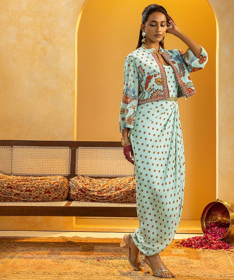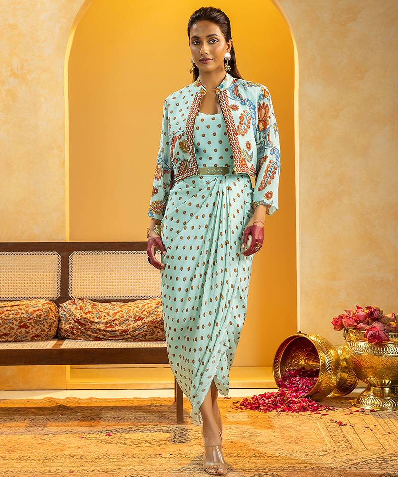 Product Description | Blue Rangtara Printed Drape Dress With Statement Metal Buckle, Paired With Embellished Short Jacket In Crepe.