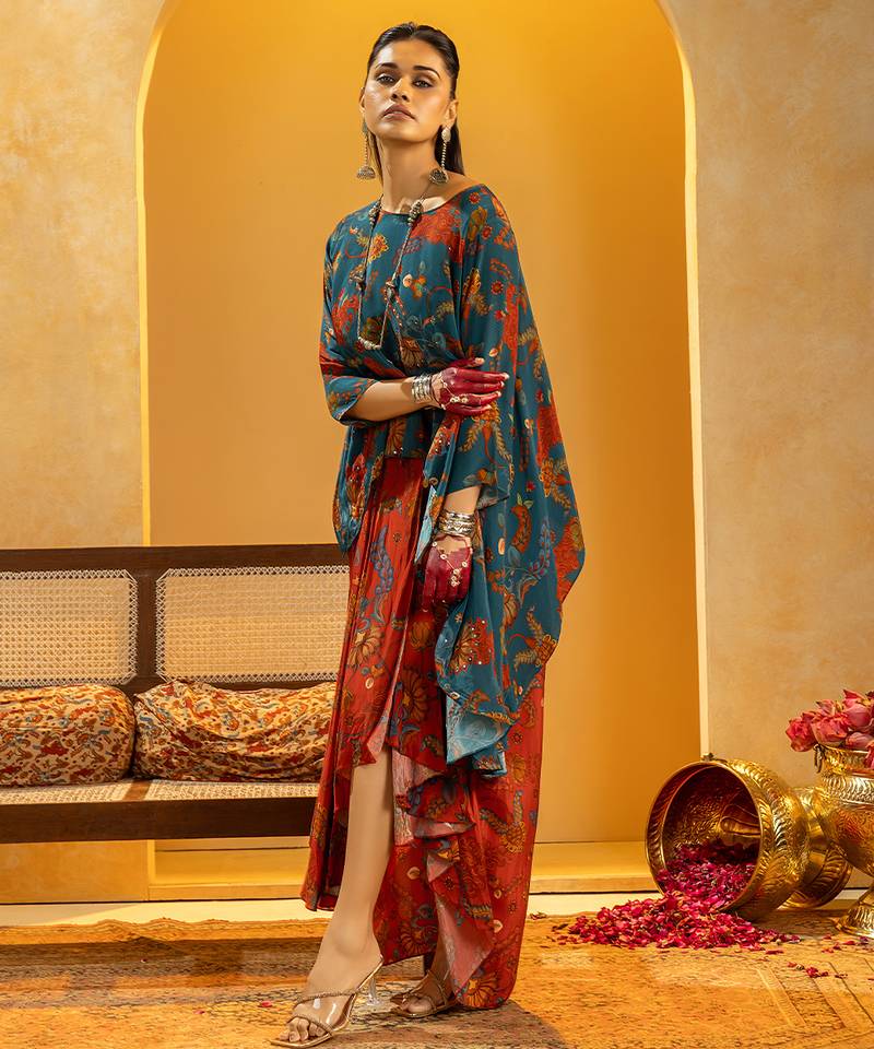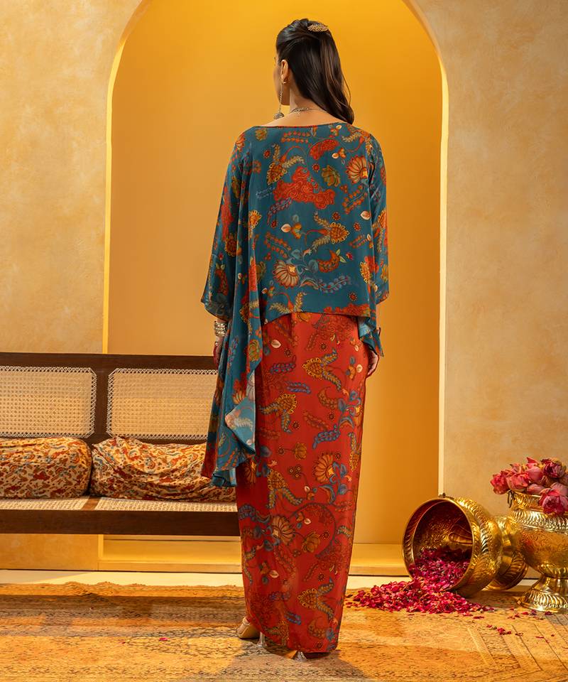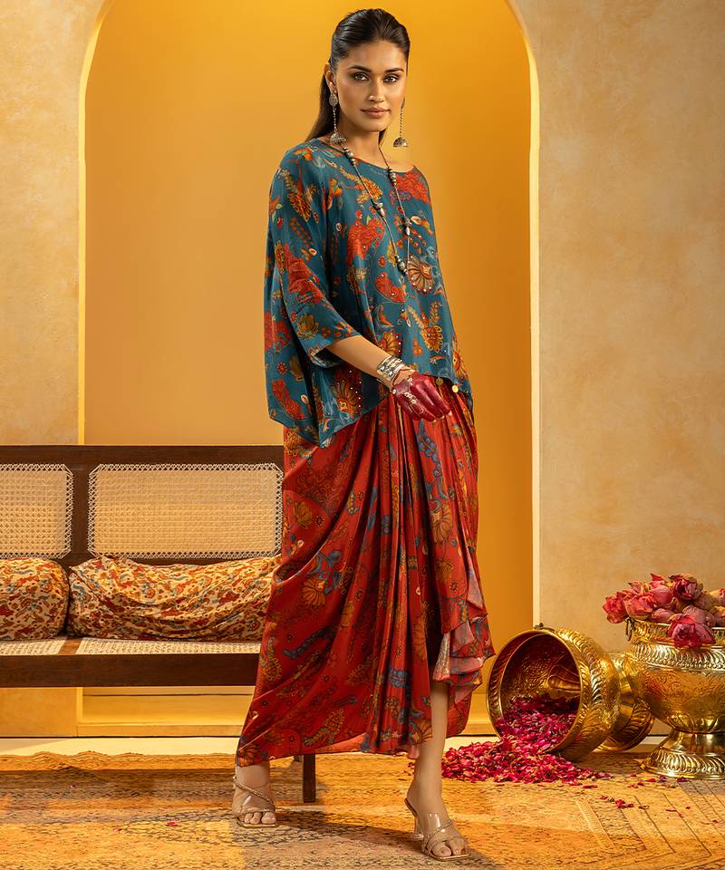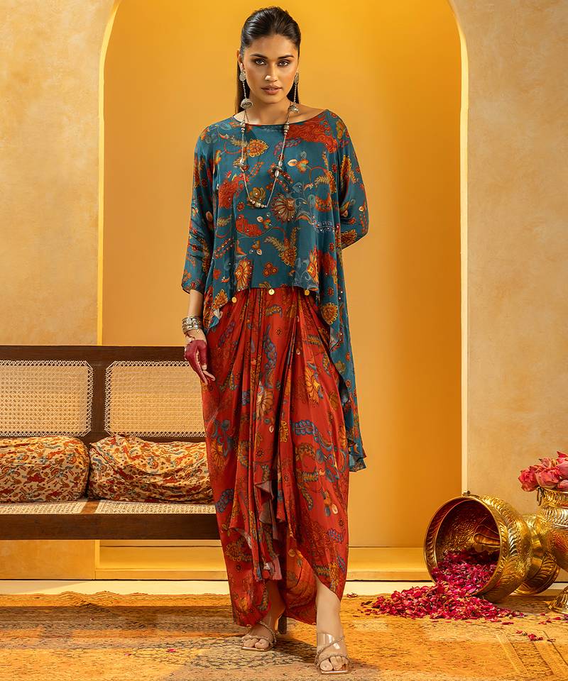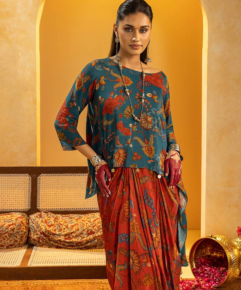 Product Description | Blue Rangtara Embellished Asymmetric Top With, Paired With A Printed Crepe Skirt.