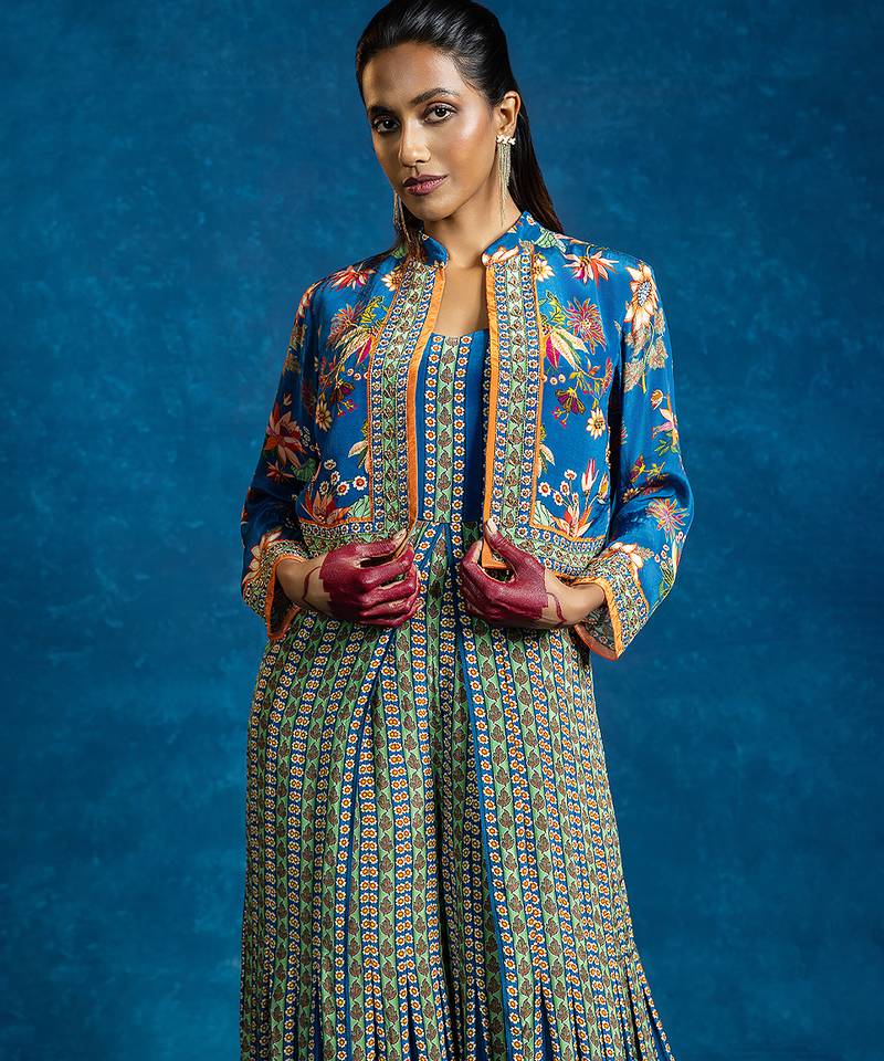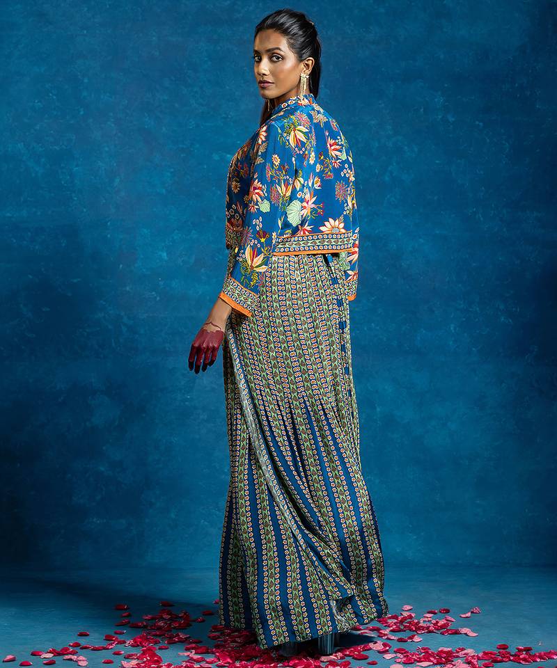Product Name | Blue Floral Printed Crepe Jumpsuit With Jacket | |
