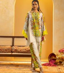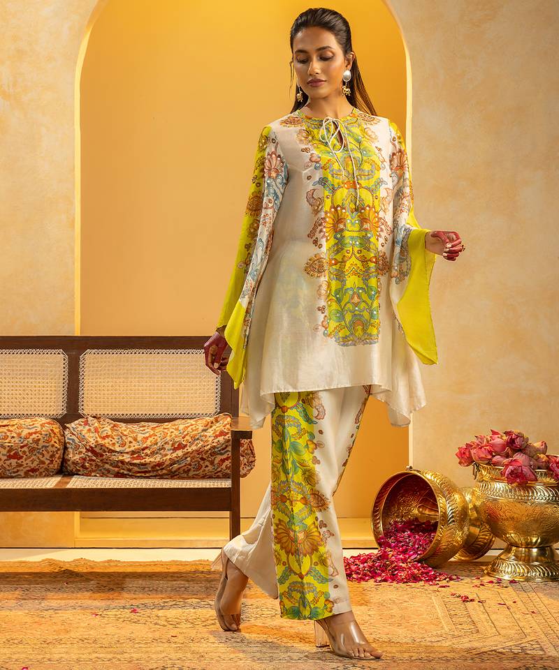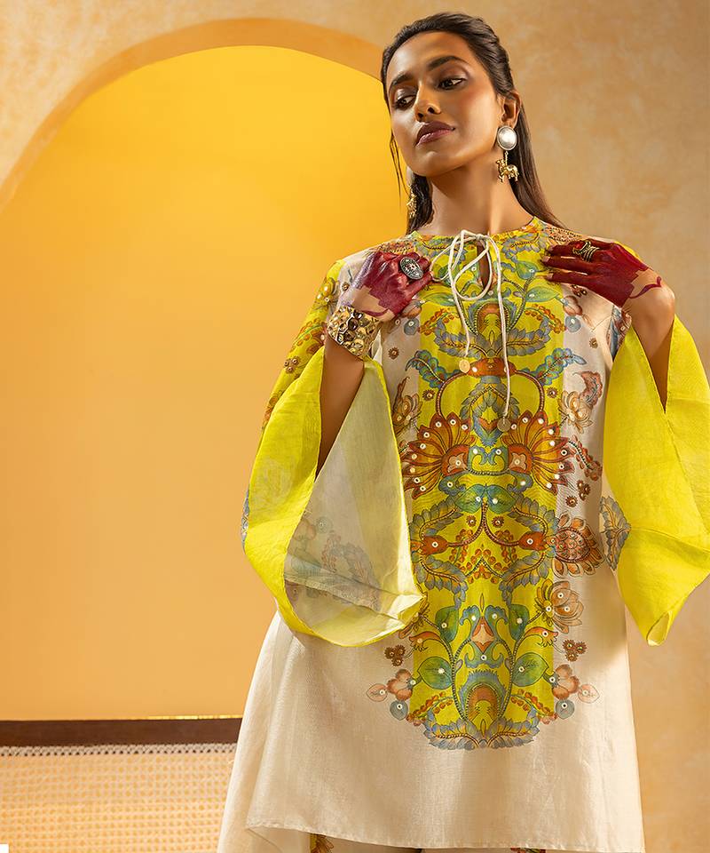 Product Description | Off White Rangtara Embellished Kurta With Fllaired Sleeves, Paired With Printed Straight Pants In Chanderi.