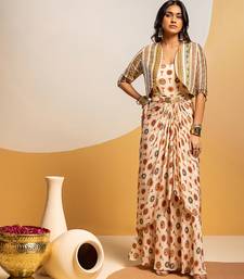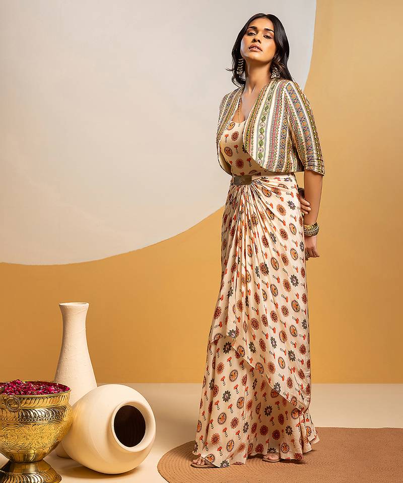 Product Description | Off White Taarani Printed Long Drape Dress In Crepe, Paired With Embroidered Jacket In Silk.