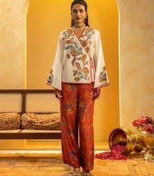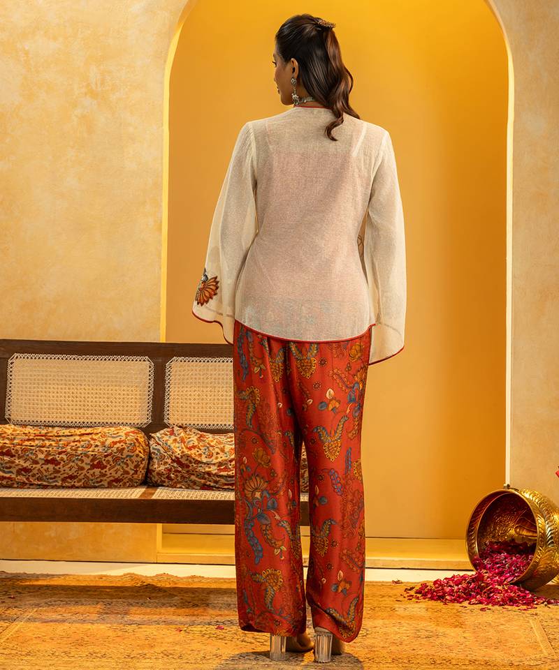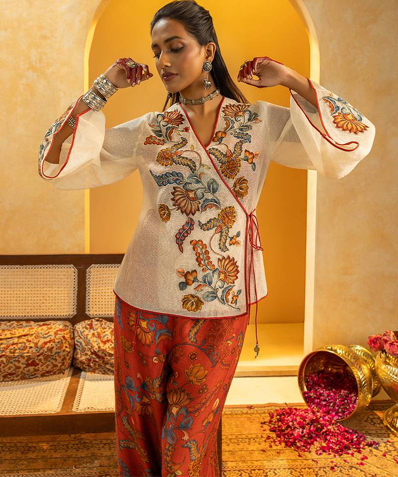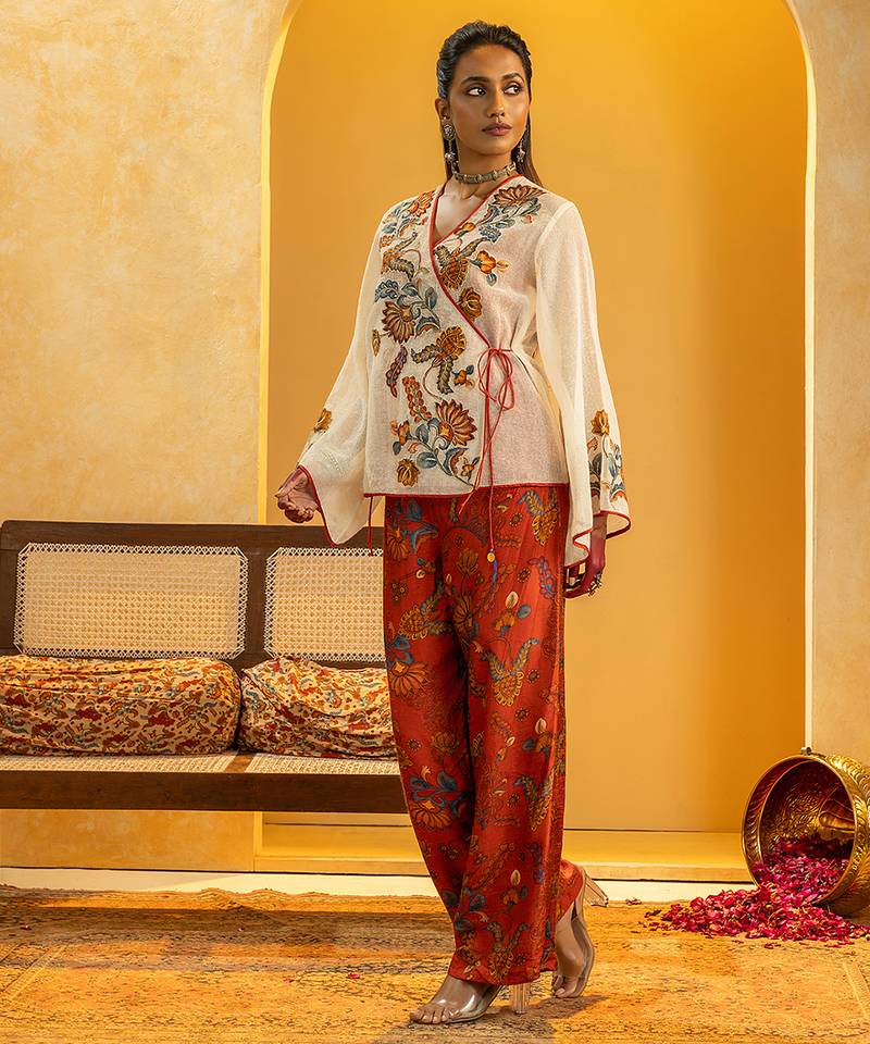 Product Description | Off White Rangtara Appliquéd Cotton Net Angarkha Top With A Front Tie Up, Paired With A Printed Silk Pant Set.
