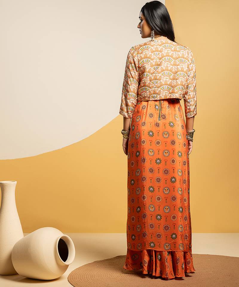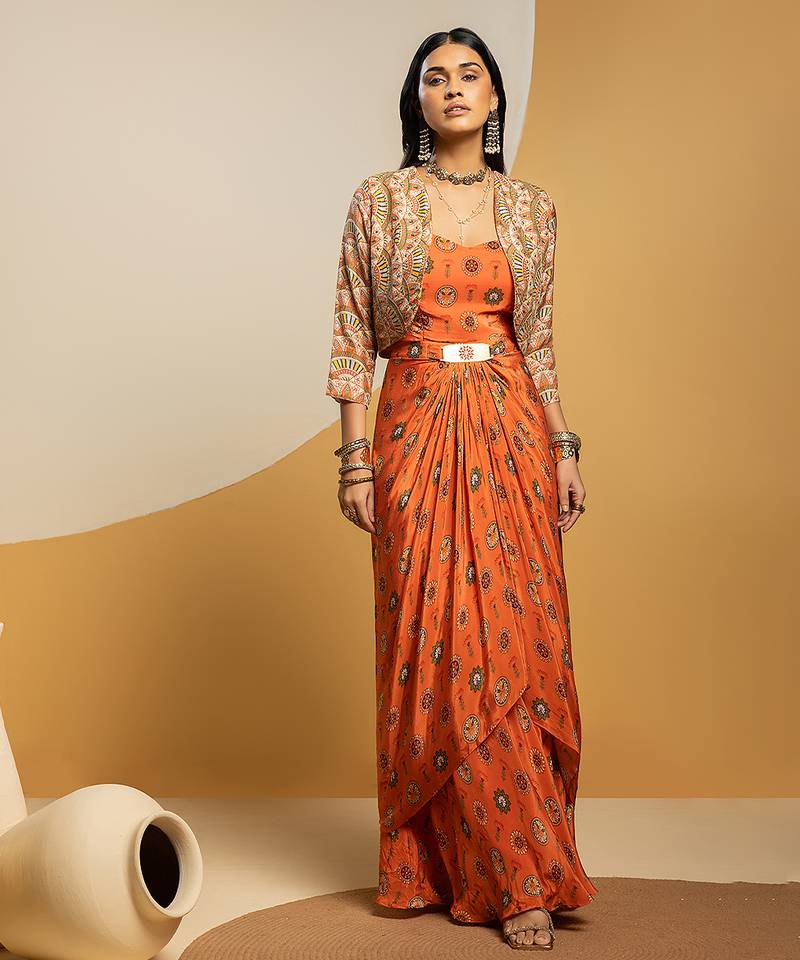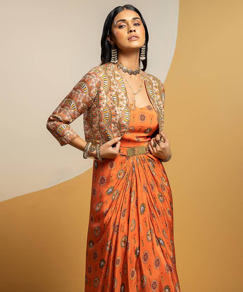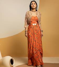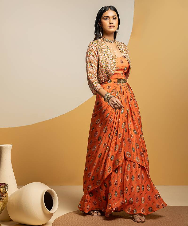 Product Description | Rust Taarani Printed Long Drape Dress In Crepe, Paired With Embroidered Jacket In Silk.