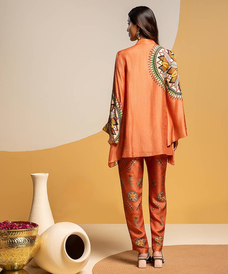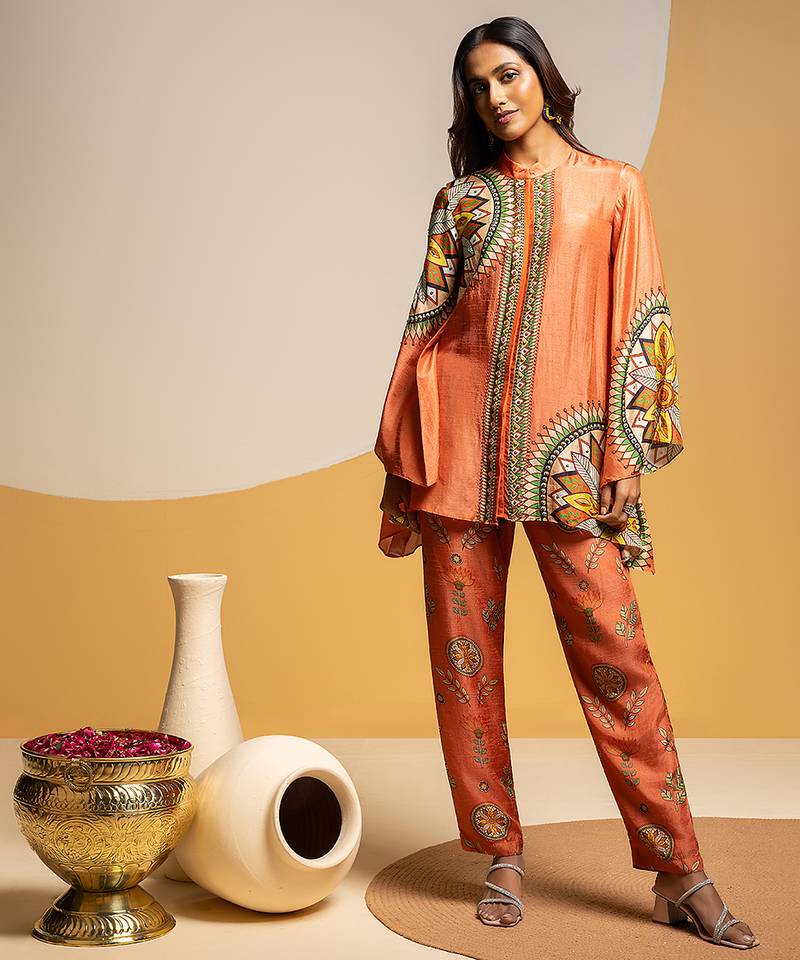 Product Description | Rust Taarani Embellished Shirt, Paired With Printed Pants In Silk.