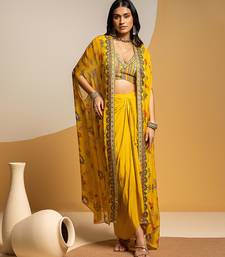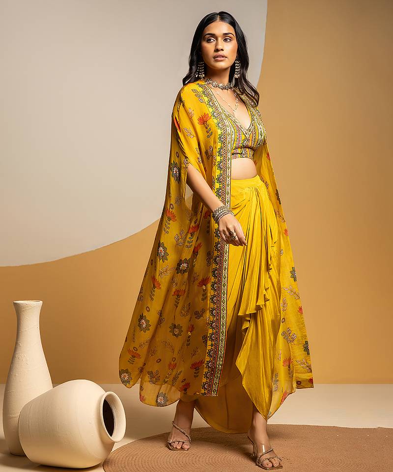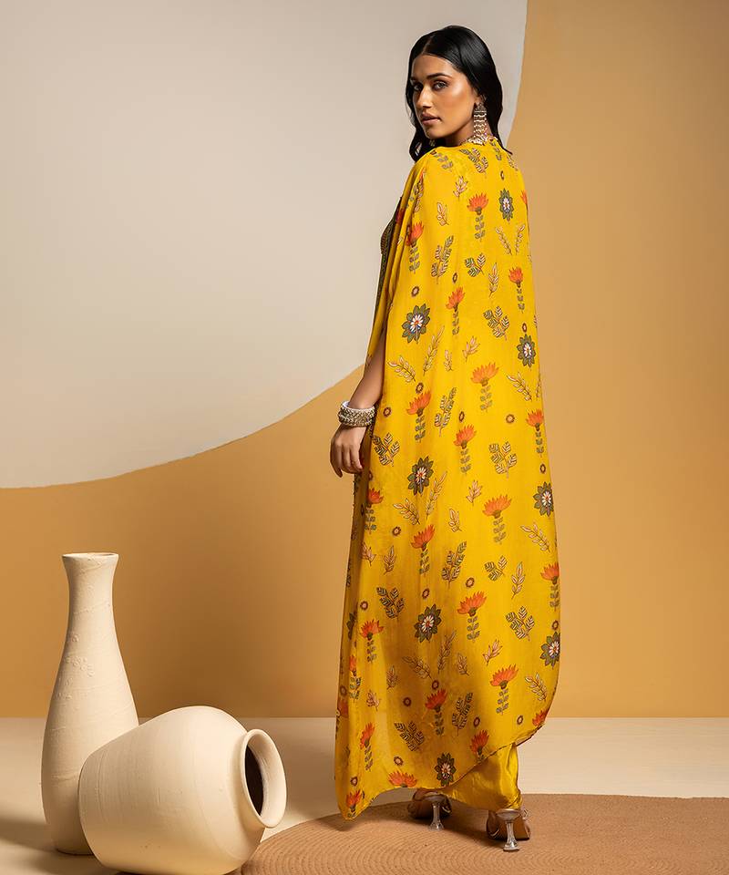 Product Name | Yellow Floral Printed Silk Co Ord Set With Cape | |