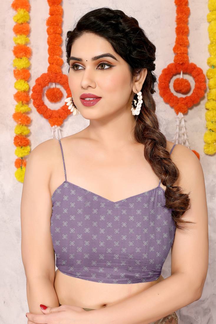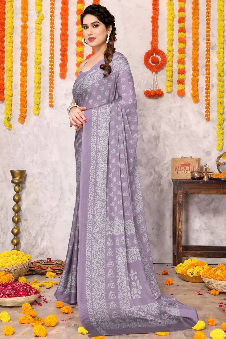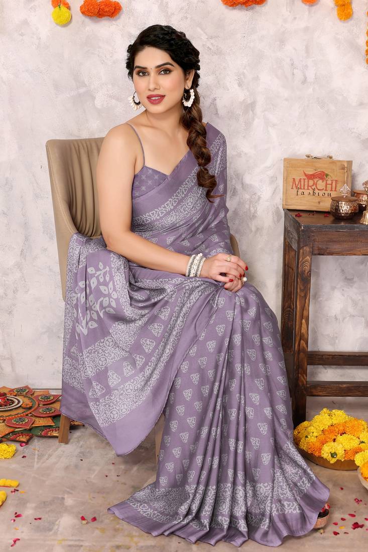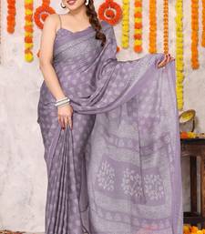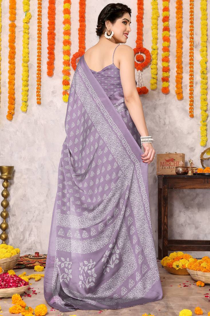 Dusty purple chiffon block print printed saree with unstitched blouse piece