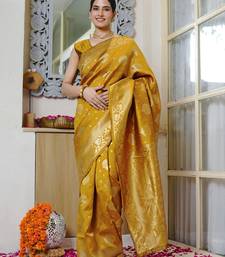 Mustard yellow woven design golden zari border silk blend saree with unstiched blouse piece