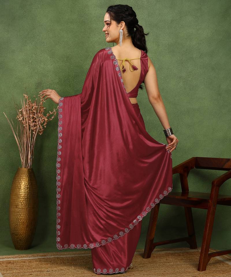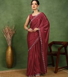 Party wear lycra solid embellished saree with unstiched blouse pieceMaroon