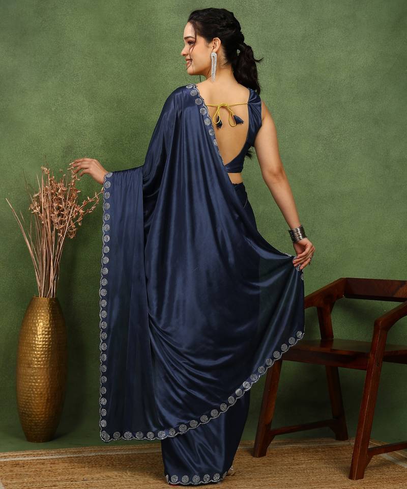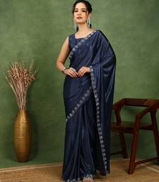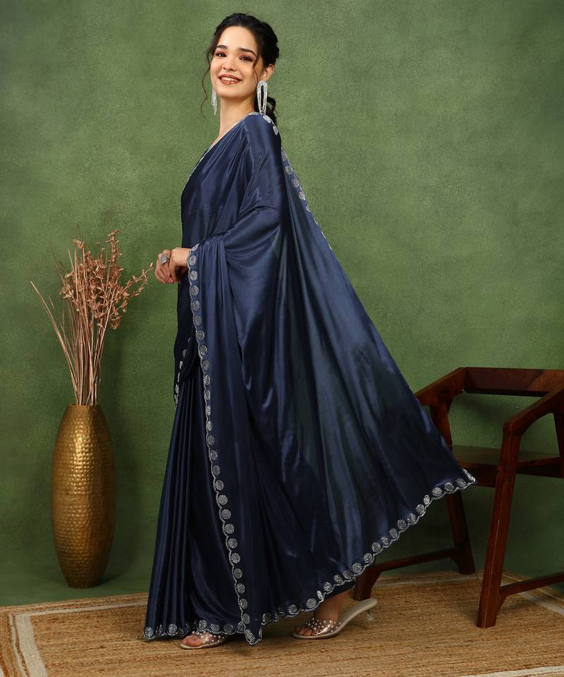 Party wear lycra solid embellished saree with unstiched blouse pieceNavy blue