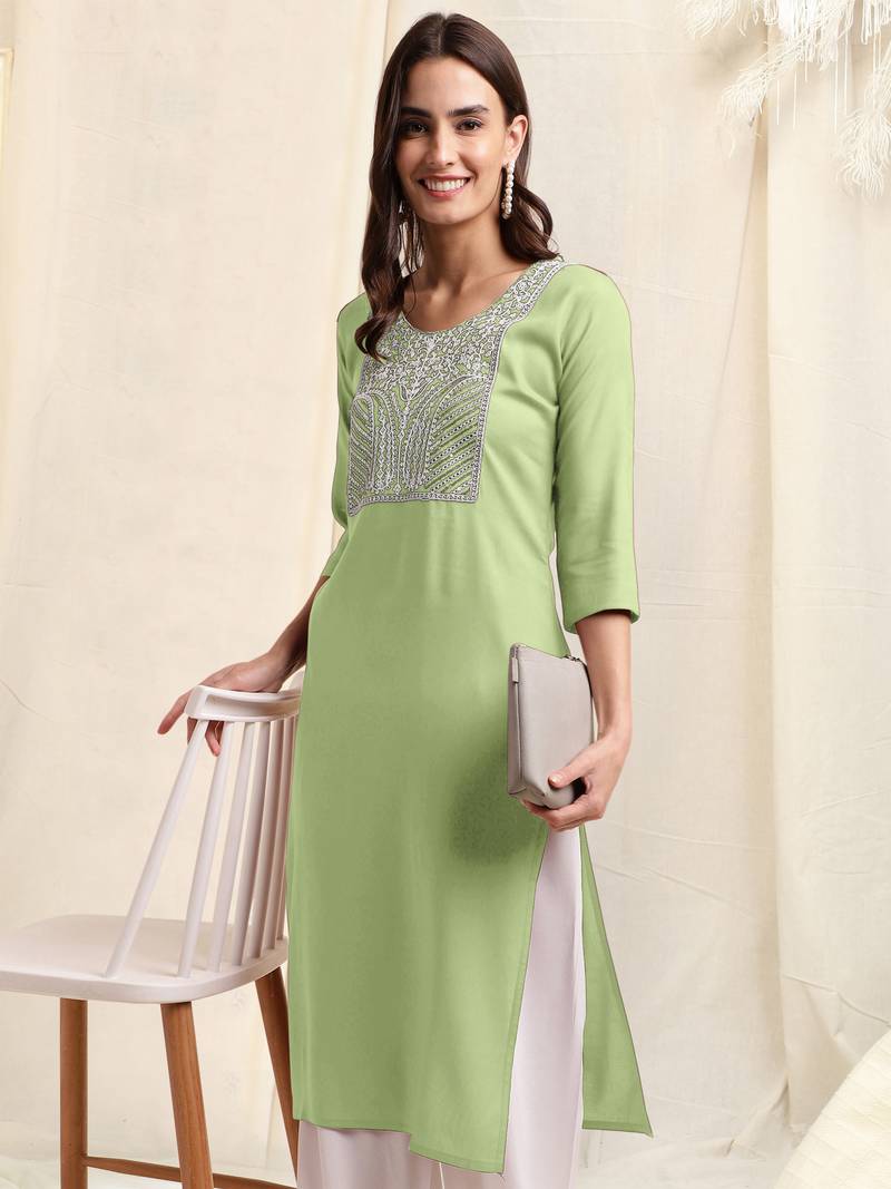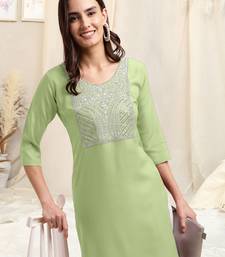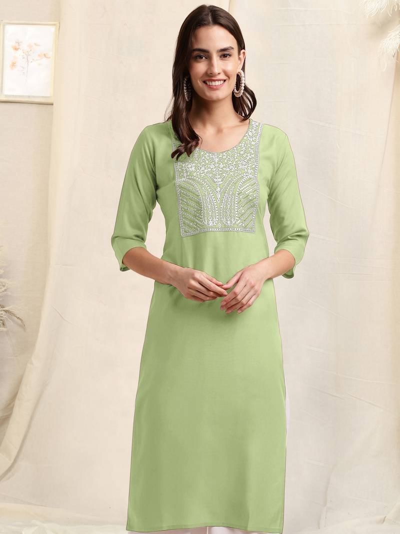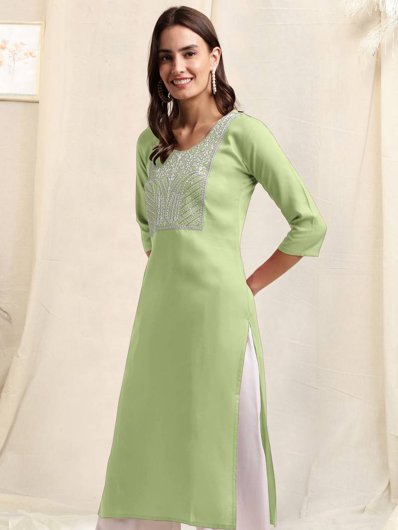 Pista green, white rayon sequins embroidery, plain pattern kurta for women