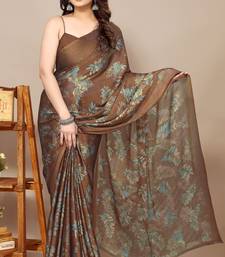 Brown leaf floral print chiffon saree with blouse piece