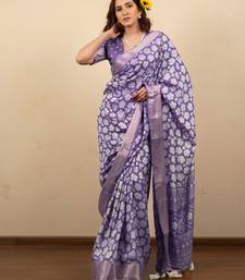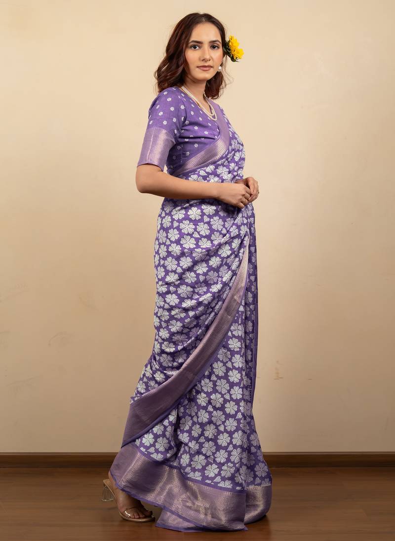 Purple floral print cotton silk saree with blouse piece