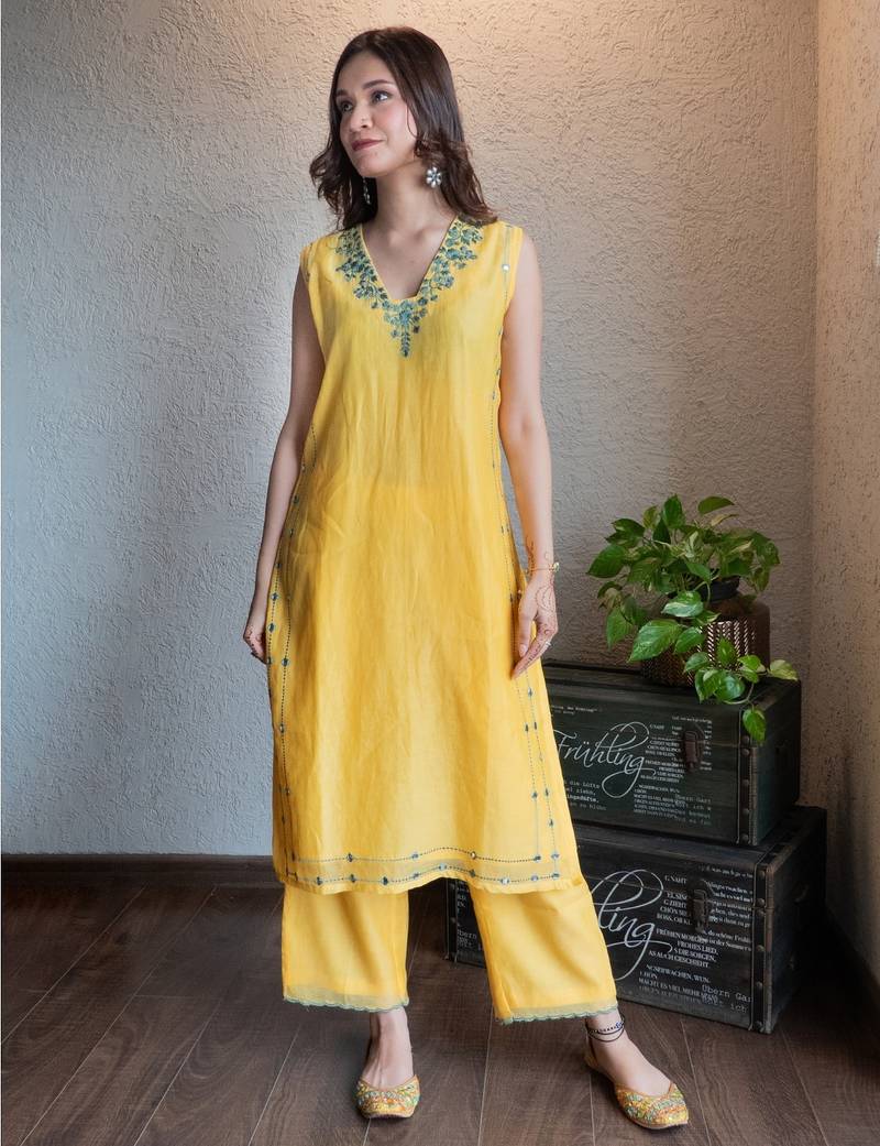 | Product Description | Bright And Cheerful, This Yellow Chanderi Kurta Set Shines With Intricate Mirrorwork Embroidery On The Kurta. Featuring Scalloped Hems On The Pants And A Colorblocked Green And Yellow Dupatta With Minimal Gota Edging, It’s A Perfect Blend Of Traditional Charm And Modern Simplicity. |