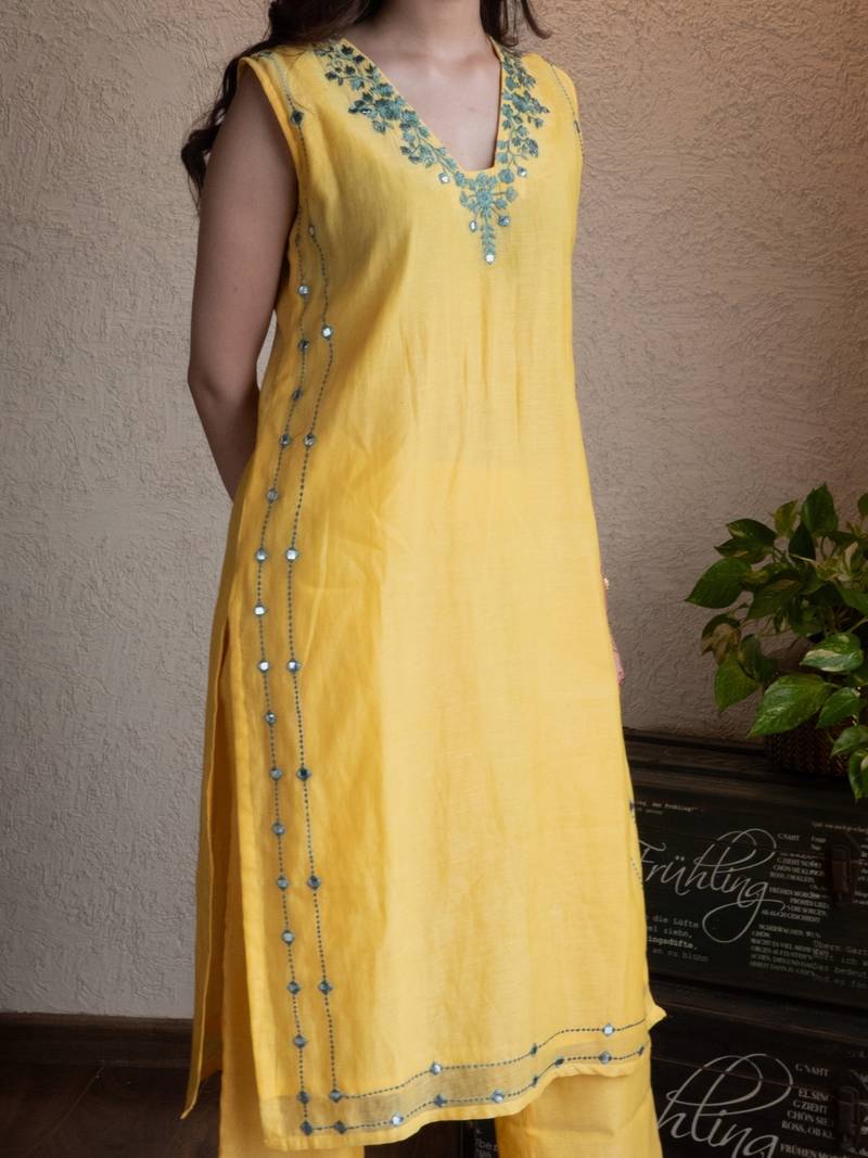 Yellow chanderi mirrorwork embroidered kurta set with dupatta stitched