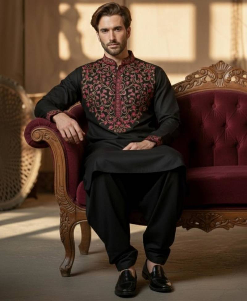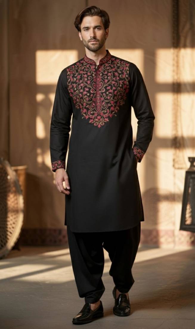 | Product Description | Product: Black Cotton Embroidery Kurta Dhoti. Top Fabric: Cotton. Bottom Fabric: Cotton. Work: Embroidery. Slight Variation In Color / Design / Print May Vary. |