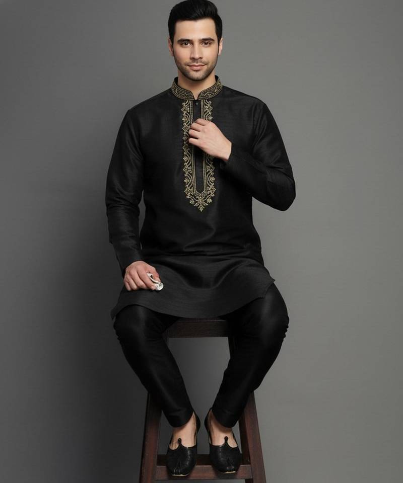 | Product Description | Product: Black Dupion Embroidery Kurta Pajama. Top Fabric: Dupion. Bottom Fabric: Dupion. Work: Embroidery. Slight Variation In Color / Design / Print May Vary. |