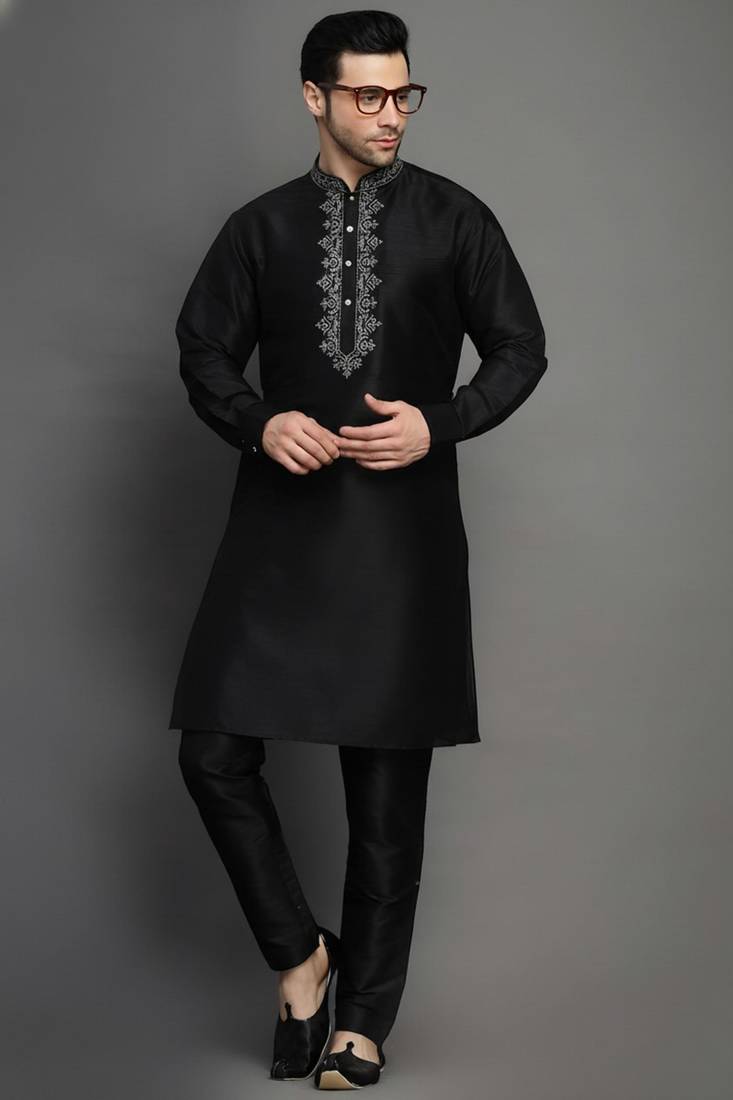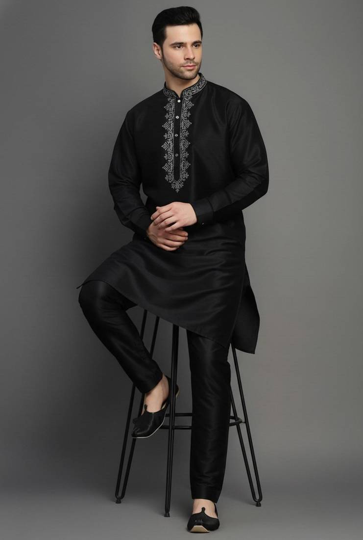 | Product Description | Product: Black Dupion Embroidery Kurta Pajama. Top Fabric: Dupion. Bottom Fabric: Dupion. Work: Embroidery. Slight Variation In Color / Design / Print May Vary. |