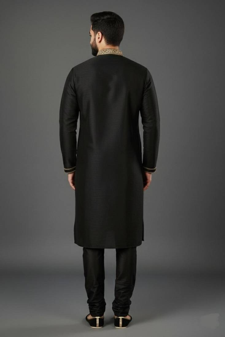 | Product Description | Product: Black Dupion Embroidery Kurta Pajama. Top Fabric: Dupion. Bottom Fabric: Dupion. Work: Embroidery. Slight Variation In Color / Design / Print May Vary. |