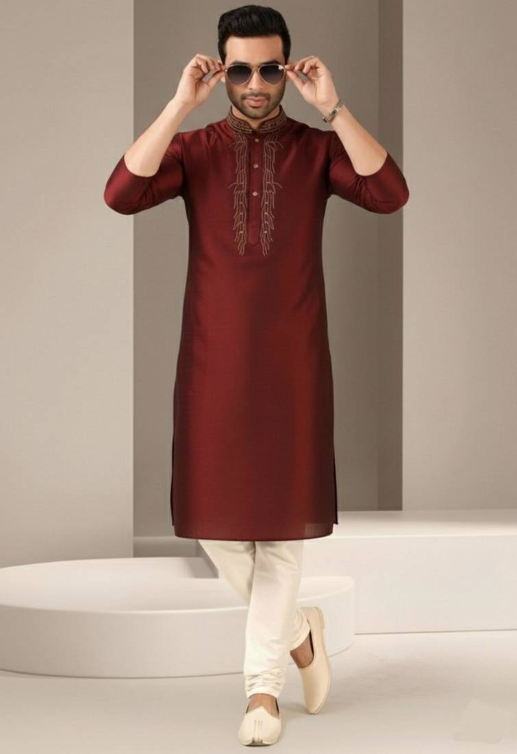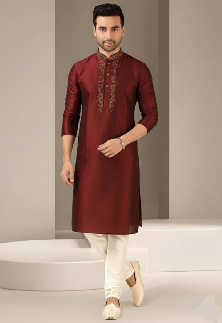 Maroon dupion embroidery kurta-pajama