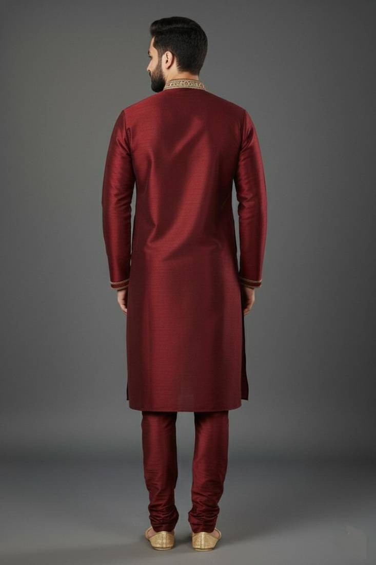 | Product Description | Product: Maroon Dupion Embroidery Kurta Pajama. Top Fabric: Dupion. Bottom Fabric: Dupion. Work: Embroidery. Slight Variation In Color / Design / Print May Vary. |