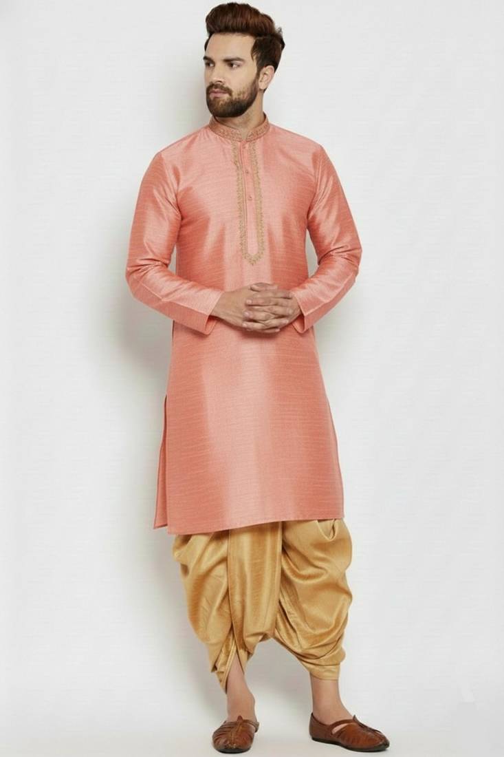 | Product Description | Peach Embroidered Dupion Art Silk Kurta Set |