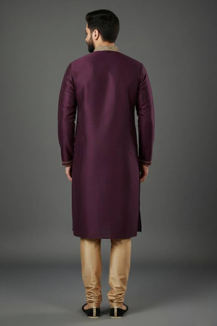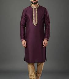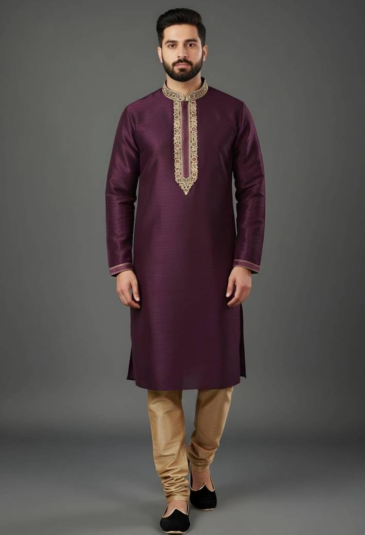 | Product Description | Product: Purple Dupion Embroidery Kurta Pajama. Top Fabric: Dupion. Bottom Fabric: Dupion. Work: Embroidery. Slight Variation In Color / Design / Print May Vary. |