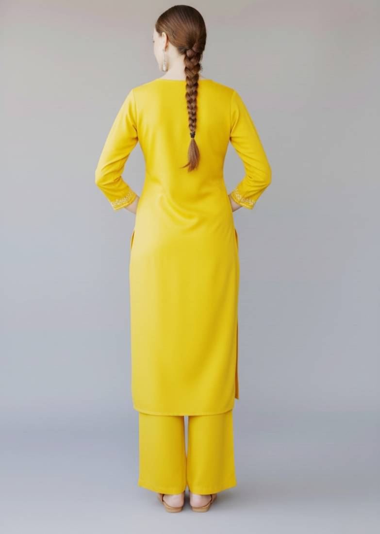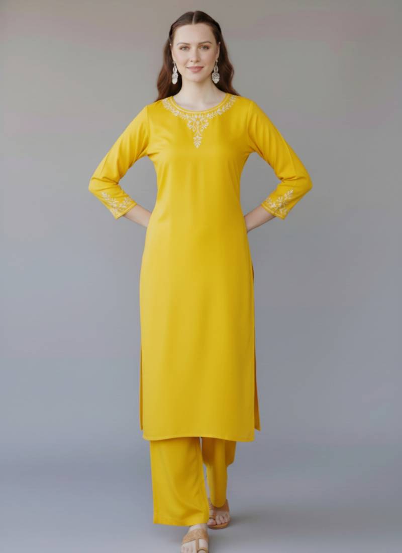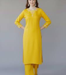 Yellow embroidered rayon kurta set stitched