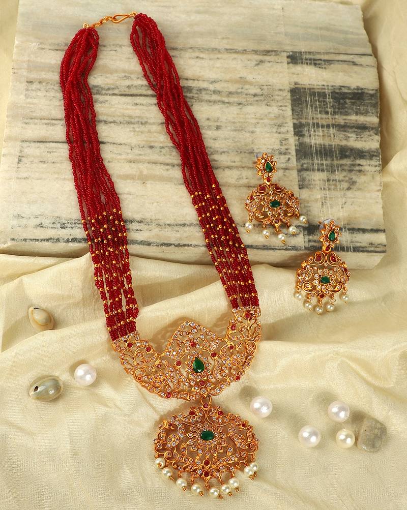 Product Name | Ad Emeralds Studded Red Beads Layered Long Necklace | |