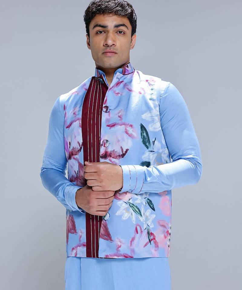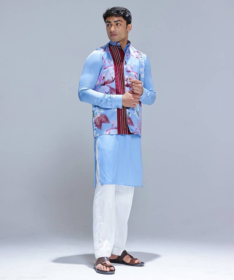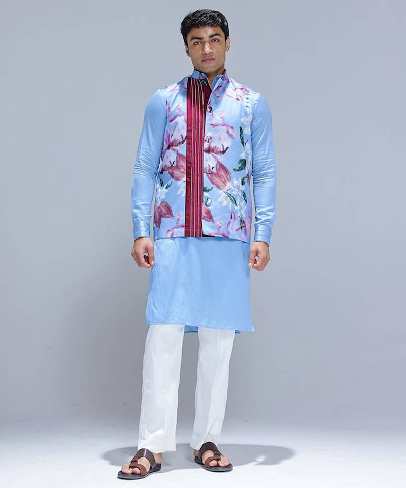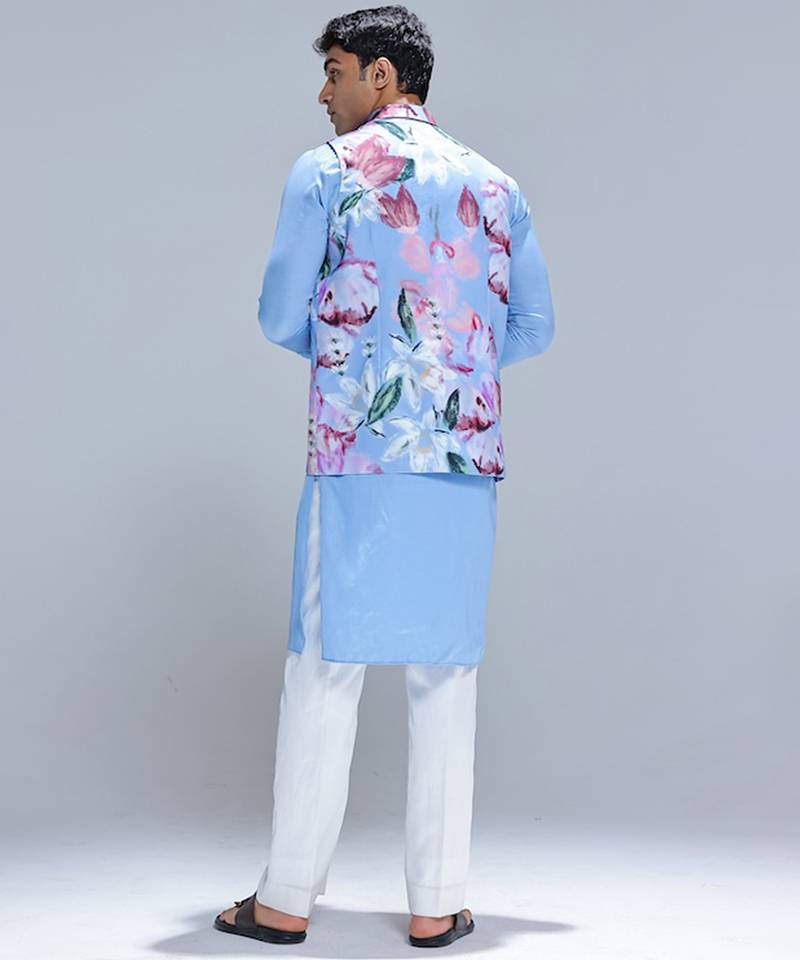 | Product Name | Blue Printed Cotton Silk Nehru Jacket Set | |