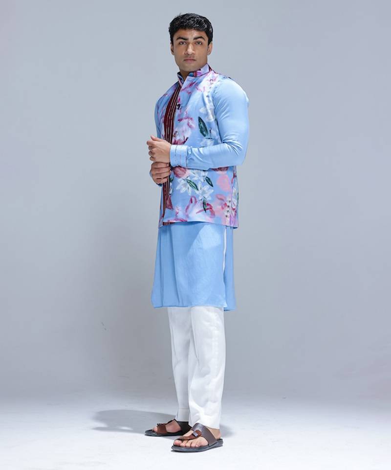 | Product Description | This Blue Printed Cotton Silk Kurta Jacket Set Exudes Refined Elegance With Its Soft Sheen And Smooth, Comfortable Drape. The Vibrant Prints Add A Stylish, Contemporary Charm, While The Matching Jacket Enhances Its Festive Appeal. Perfect For Celebrations, Weddings, And Cultural Events, It Blends Tradition With Modern Sophistication For A Polished Ethnic Look.