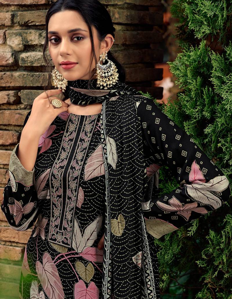 Stylee lifestyle black pashmina digital printed dress material unstitched
