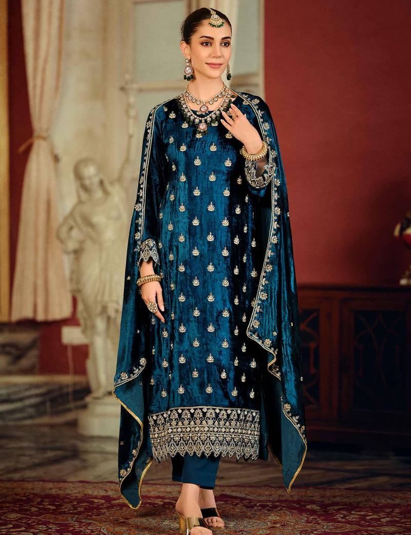 Stylee lifestyle navy blue velvet embroidered dress material unstitched