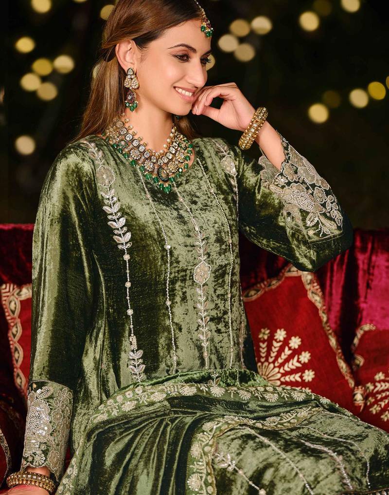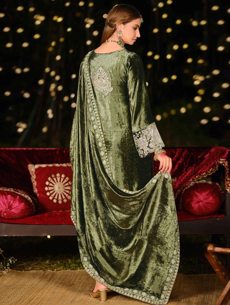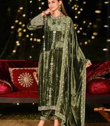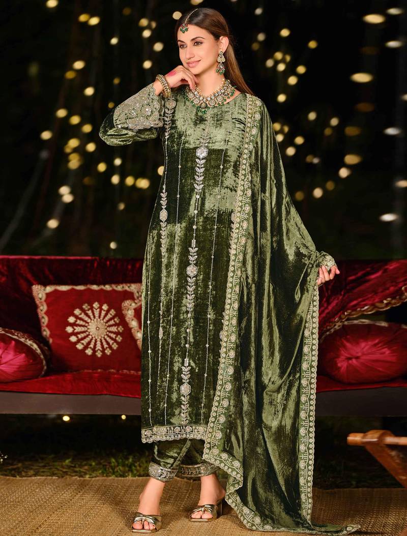 Stylee lifestyle olive velvet embroidered dress material unstitched