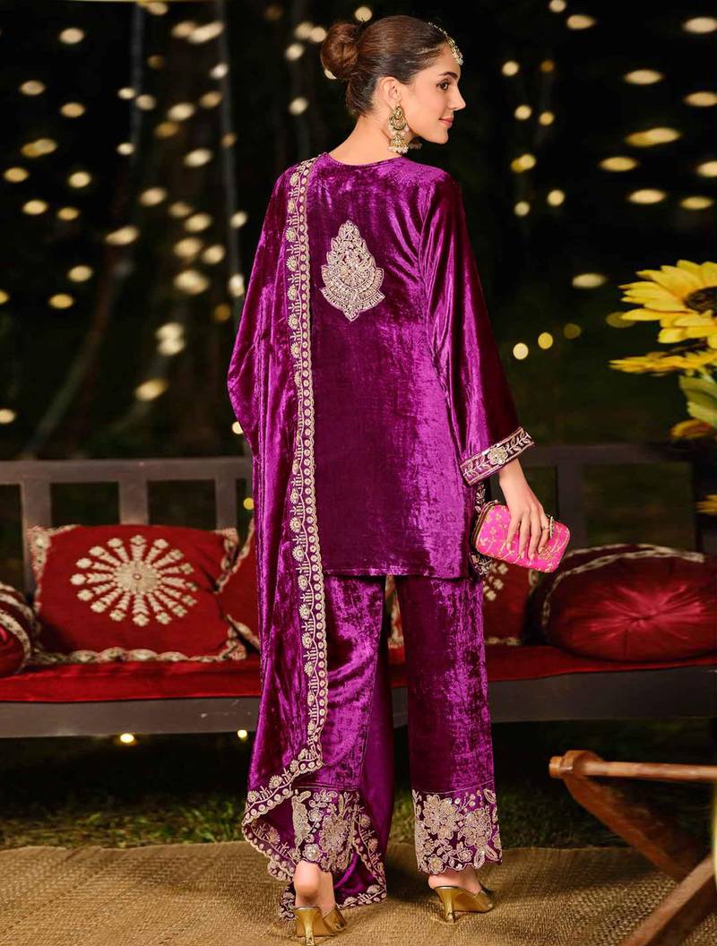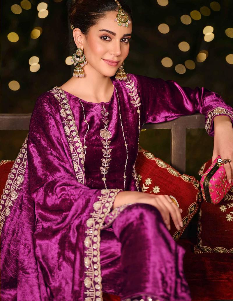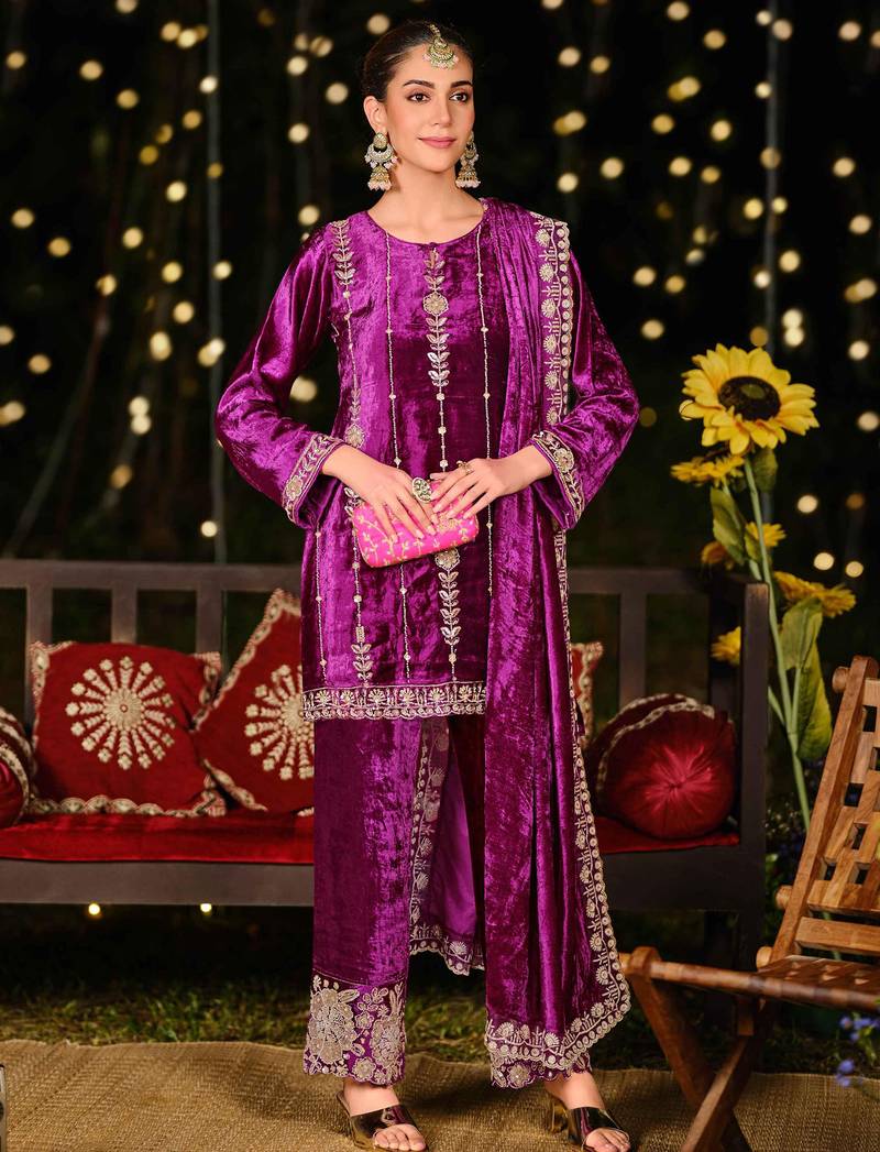 Stylee lifestyle purple velvet embroidered dress material unstitched