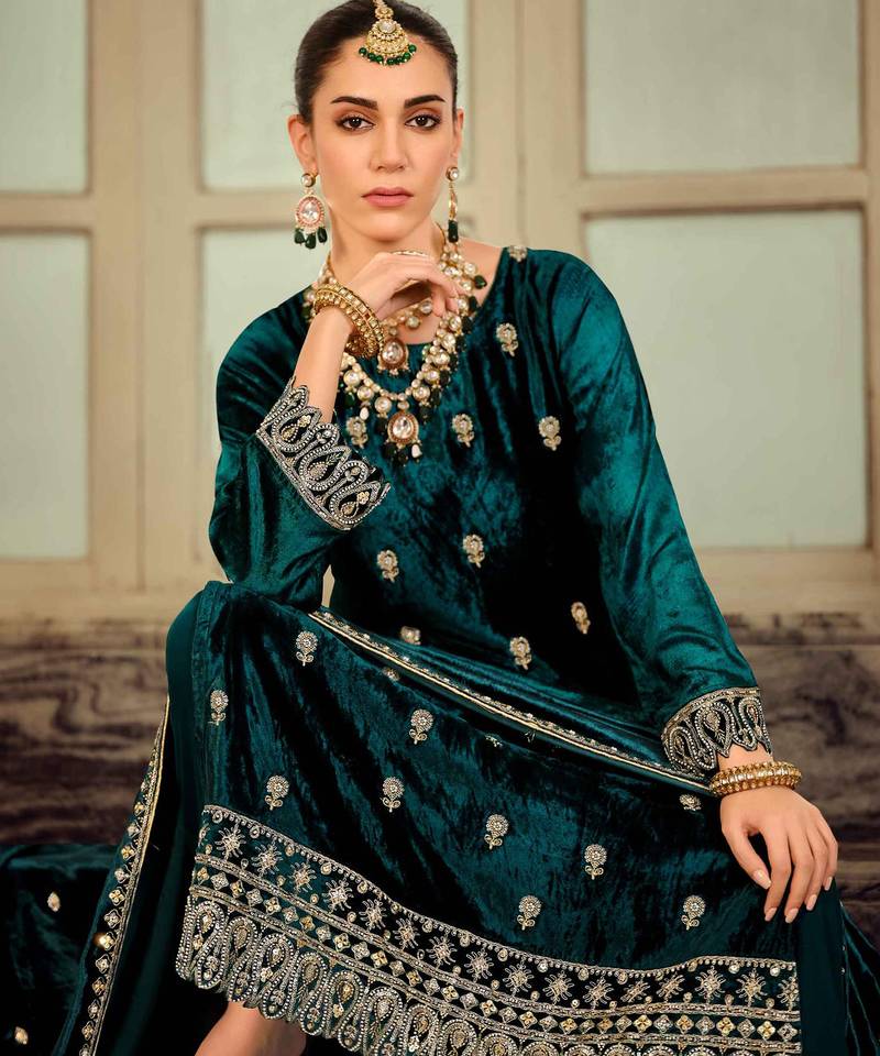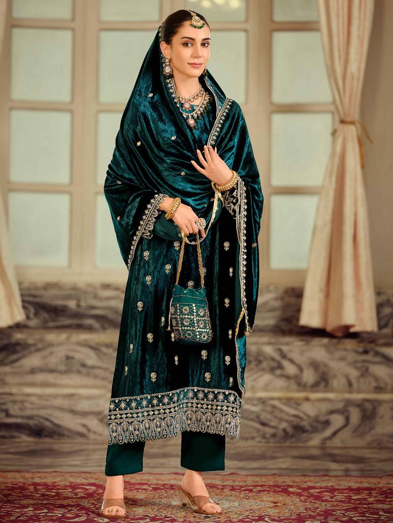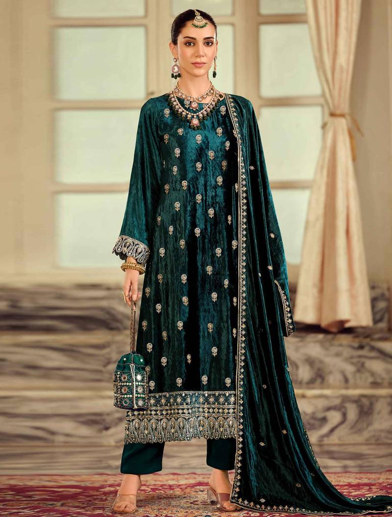 Stylee lifestyle teal velvet embroidered dress material unstitched