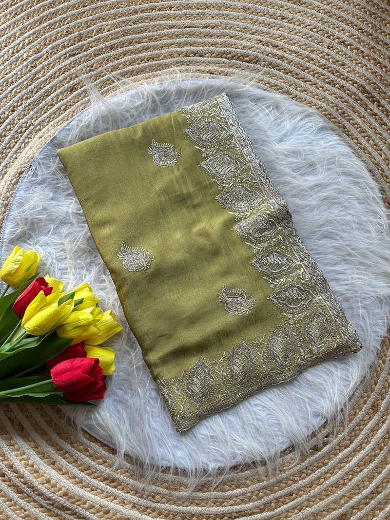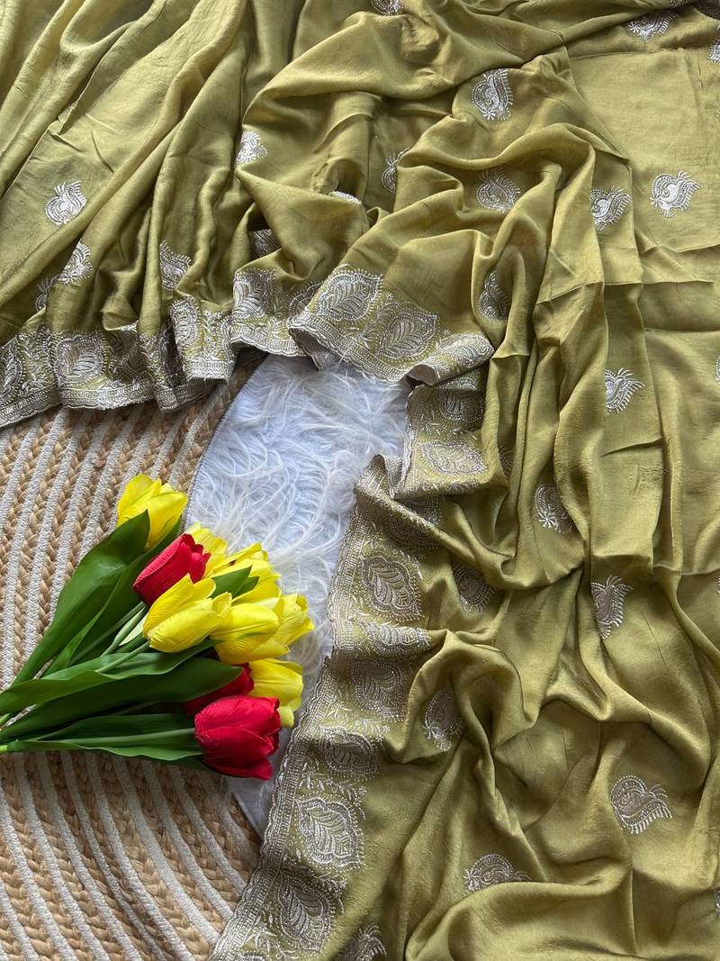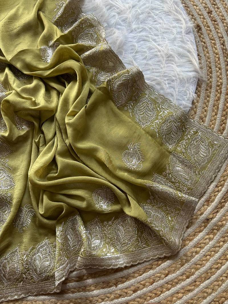 Light green color embroidery and jarkhan work satin silk saree