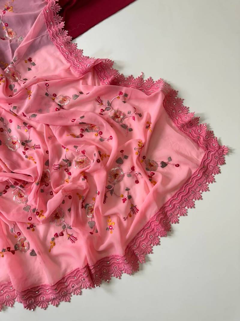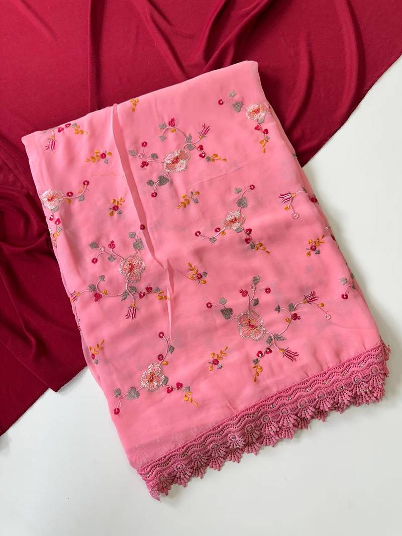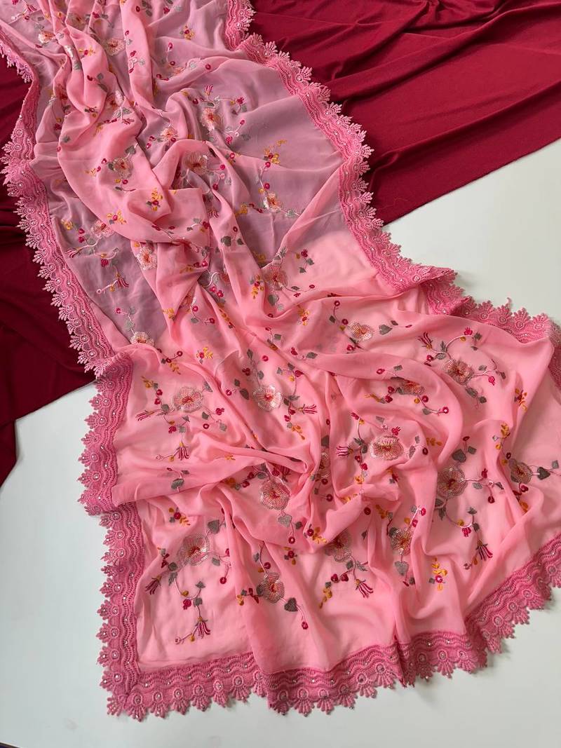 | Product Name | Light Pink Color Sequins Embroidered Jaal And Multi Thread Georgate Saree Cutwork Design | |