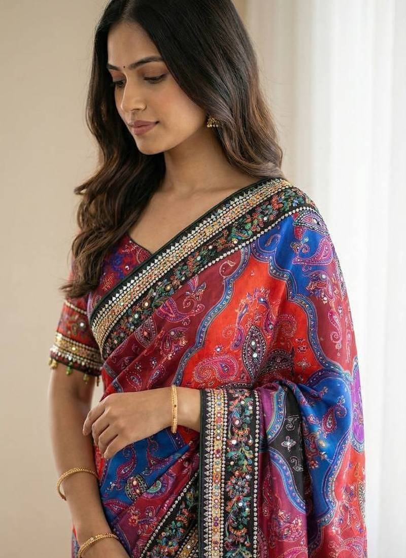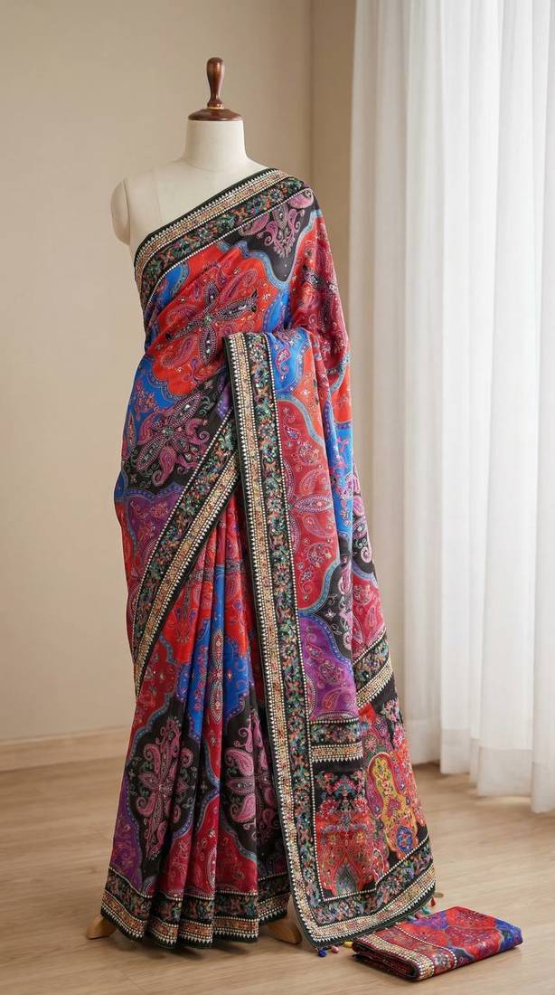 | Product Name | Multi Color Ajarakh Print And All Saree Real Mirror Work Work Silk Saree | |
