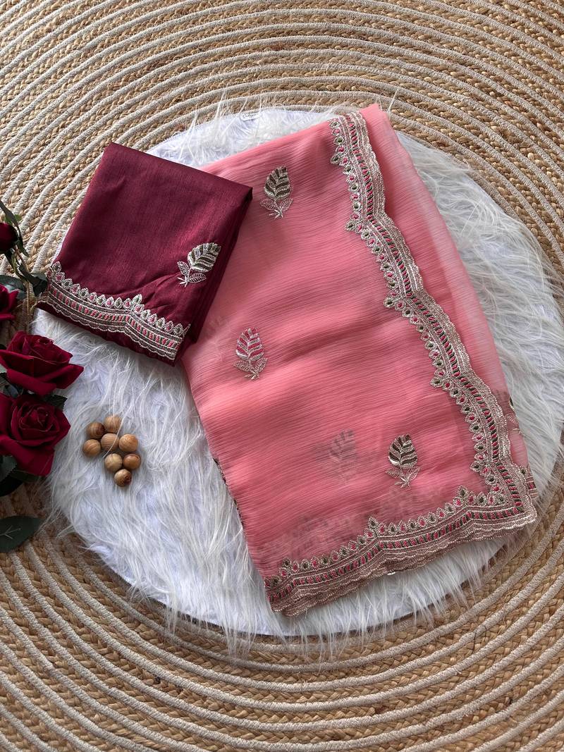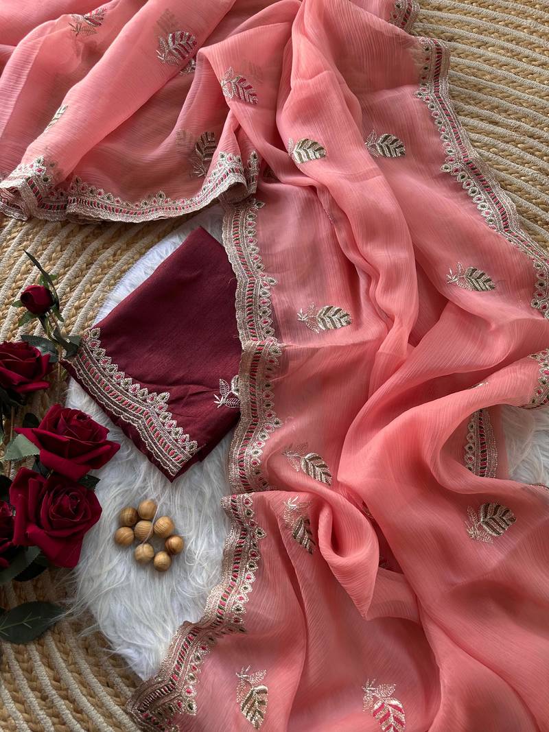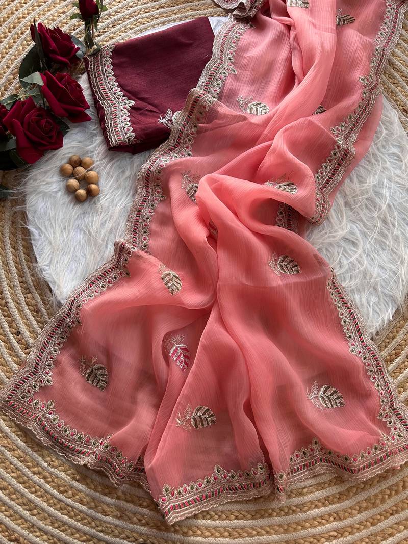 | Product Name | Peach Color Embroidery And Detailed Border Work Chiffon Saree | |