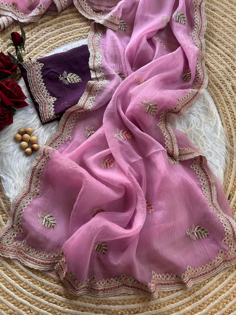 Pink color embroidery and detailed border work chiffon saree