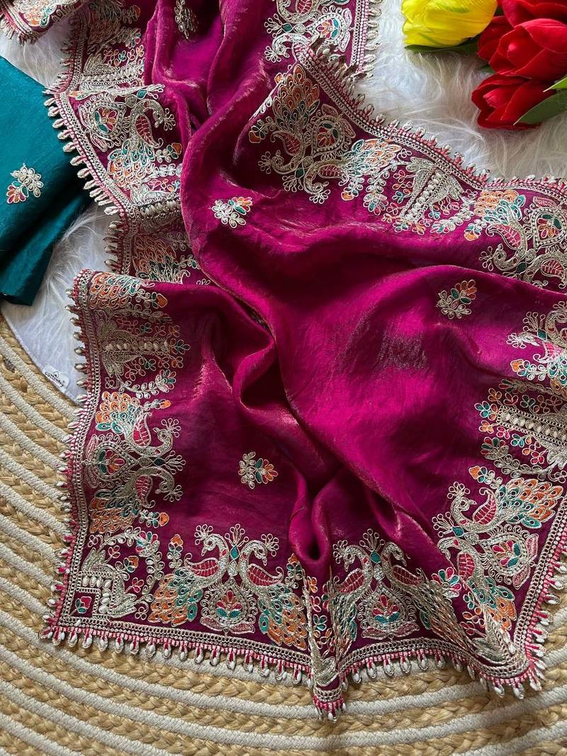 Rani pink color embroidery and butti work fandy sattin silk saree