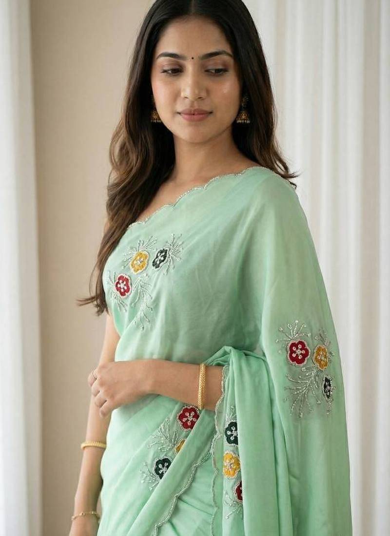 Sea green color handwork khatali butta with cutdana sequence work silk saree