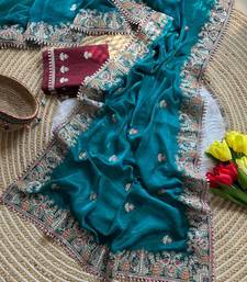 Teal color embroidery and butti work fandy sattin silk saree