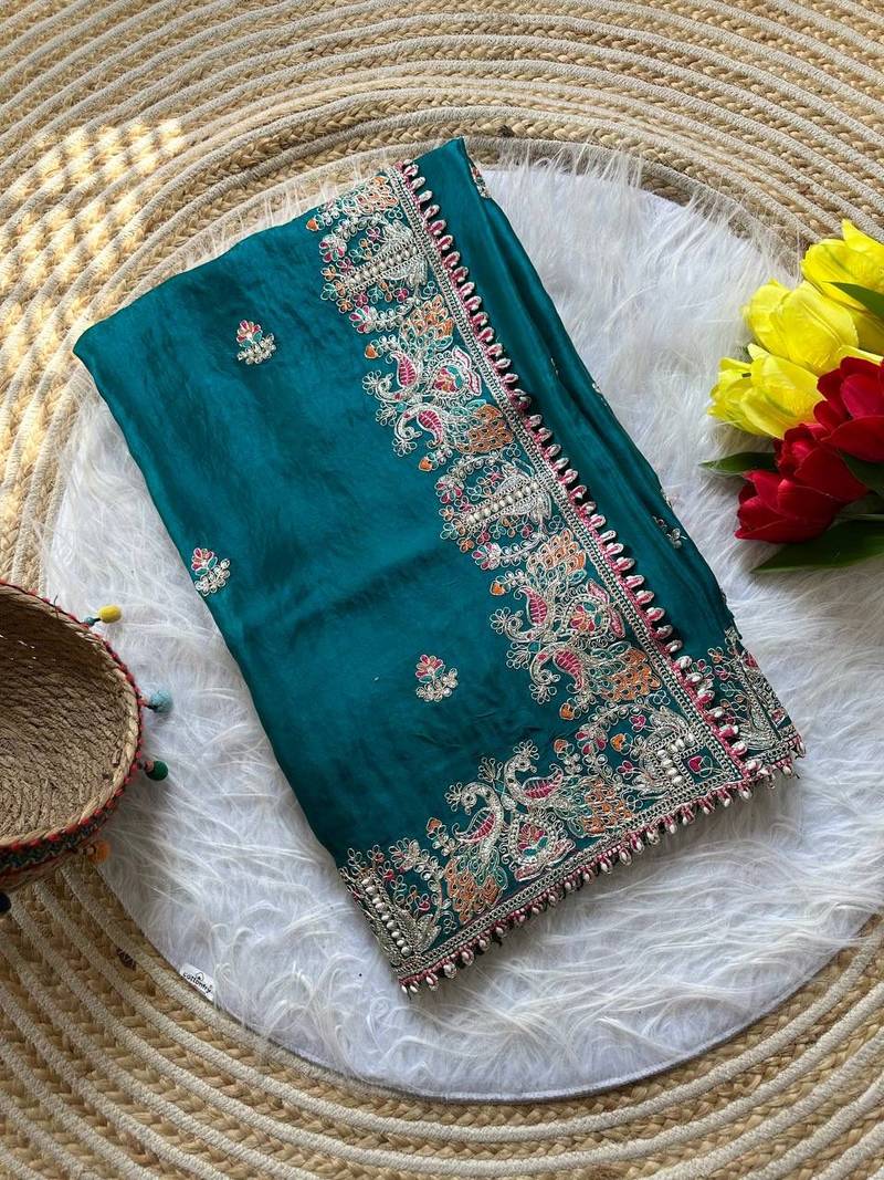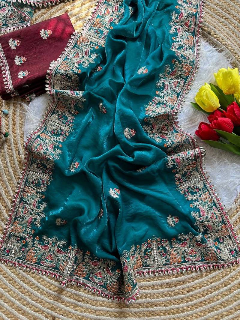 Product Name Teal Color Embroidery And Butti Work Fandy Sattin Silk Saree