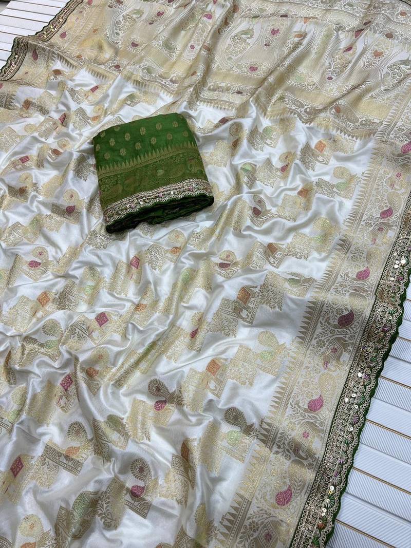 🆕 *Saree With New Amazing Embroidery Cording Sequance And Thread Work Border In Full Saree*🧵 🌺 *The *Rich And High Quality Soft, Flowing Pure Dola Silk Sarees With Meenakari N Zari Weaving Body And Zari Pallu Woven Pairs And Embroidered Koding Sequence Work Border Lace* Weight: *Approx 800 Gm* |